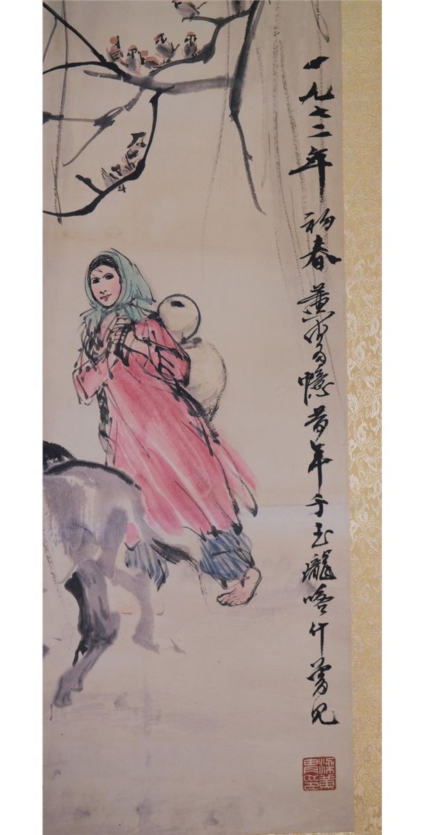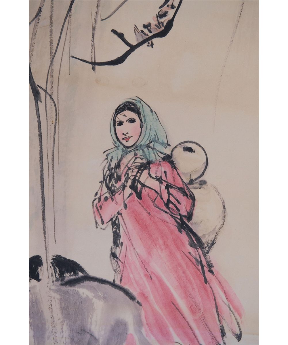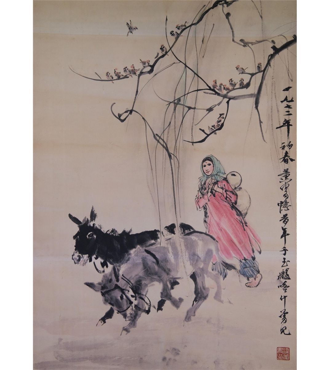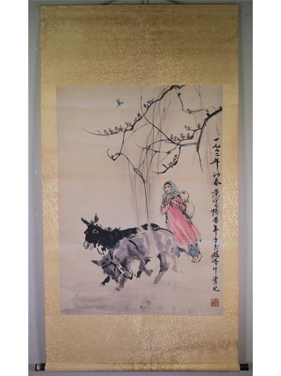 A woman with two donkeys; Chinese ink and watercolour on paper; hanging scroll; signed Huang Zhou (1925-1997) and inscribed with one artist seal; 112 cm 78 cm