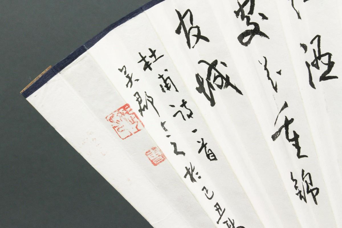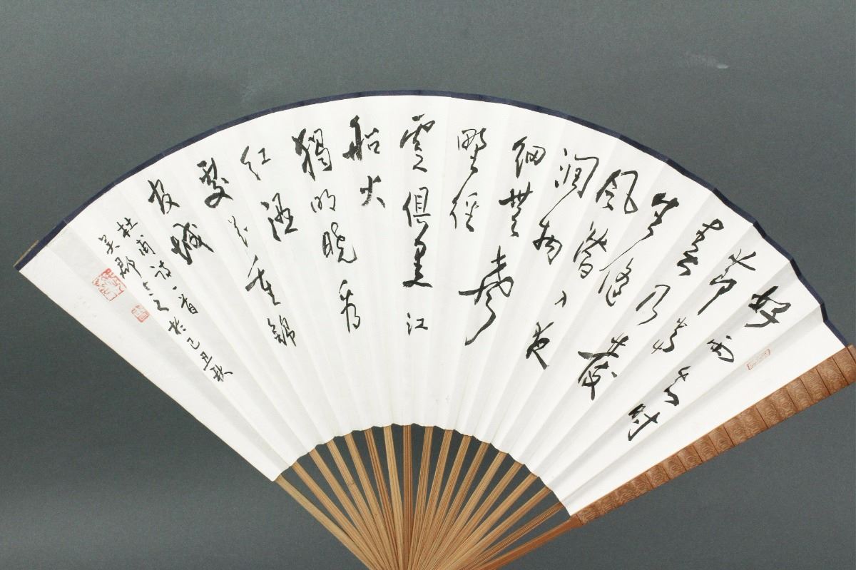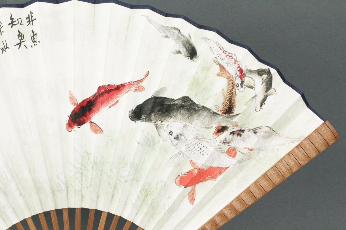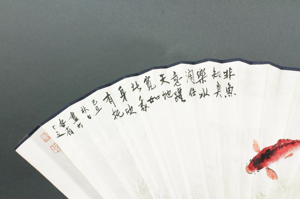 Swimming carps; Chinese ink and watercolour on fan paper; signed and inscribed with two artist seals; W: 3 cm, L: 30 cm, 60 grams total