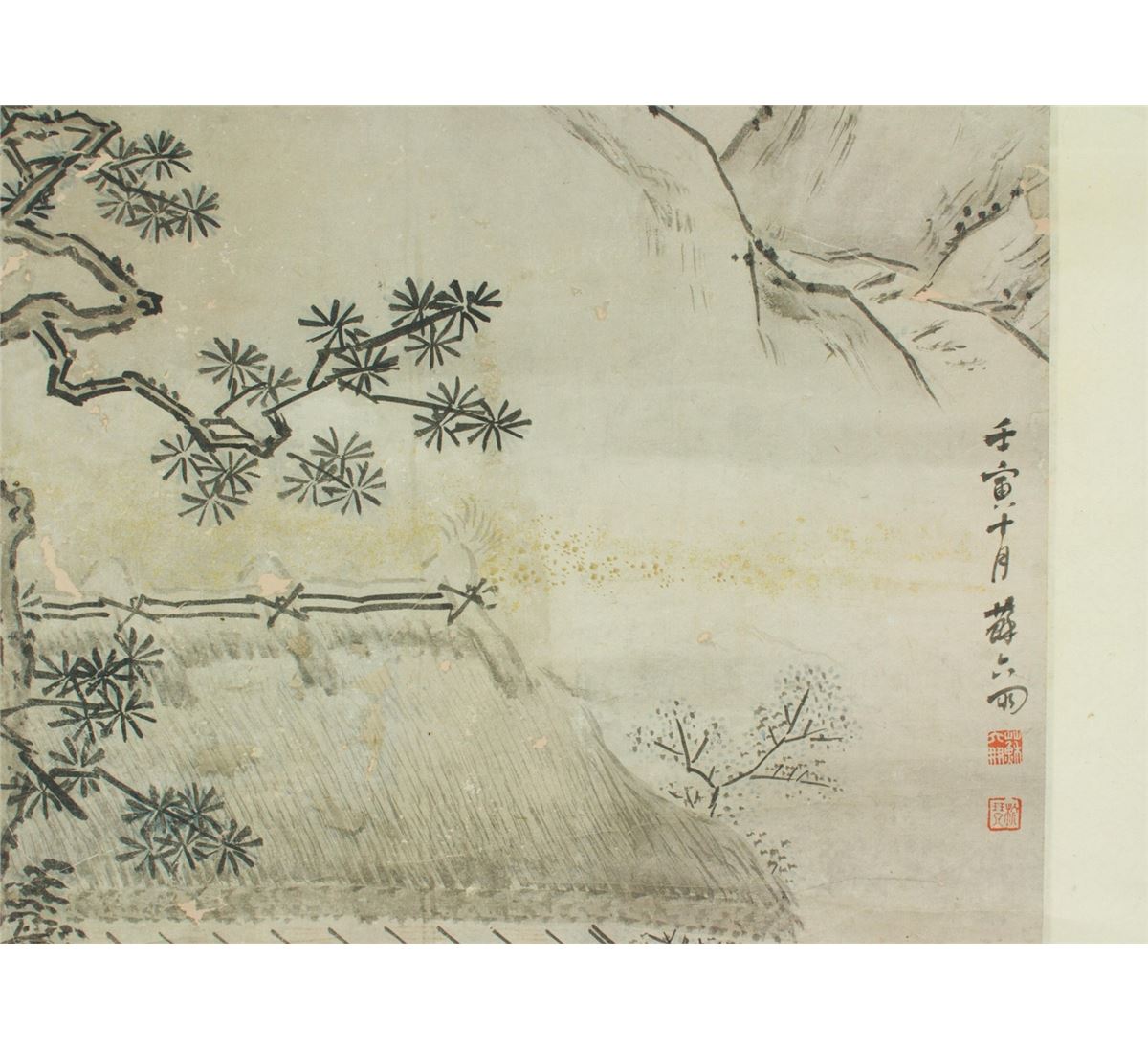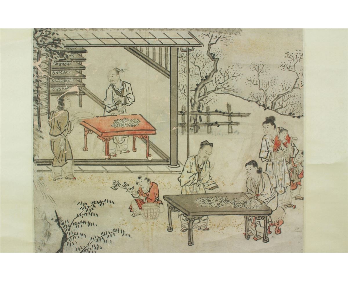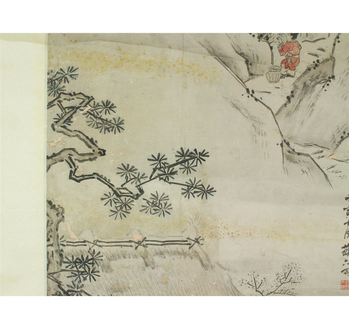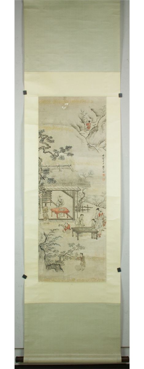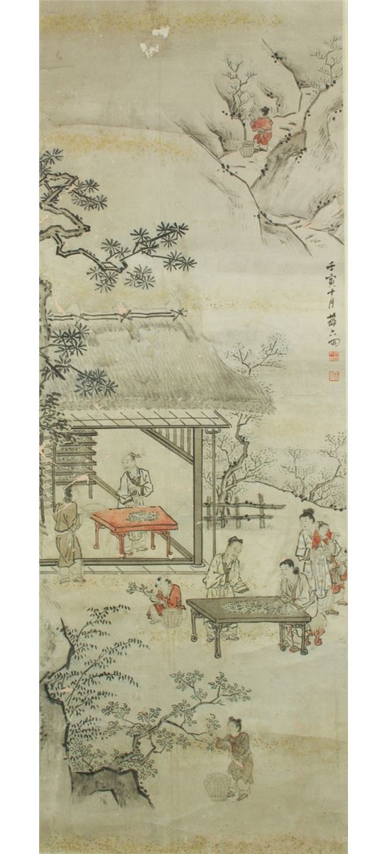 The scene of tea making in Landscape, hanging scroll, Chinese ink and watercolour on paper, signed and sealed by Su Liupeng. 114 cm X 42 cm.