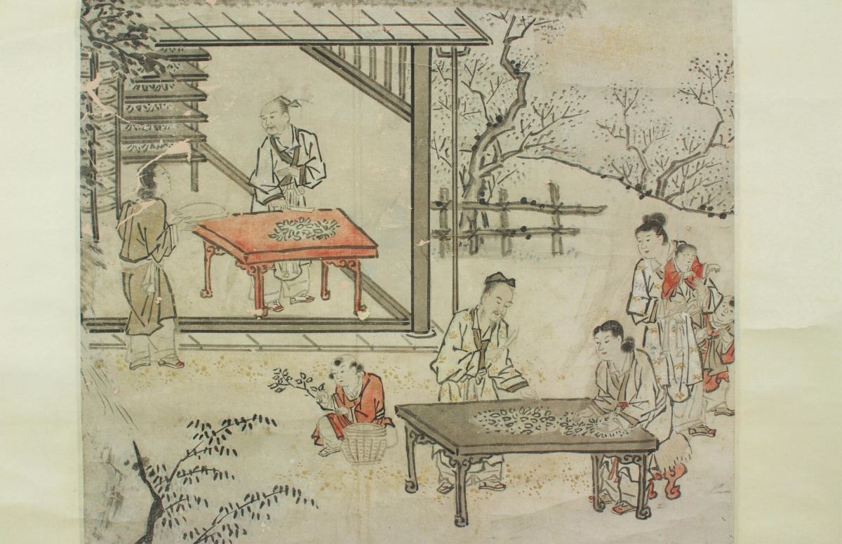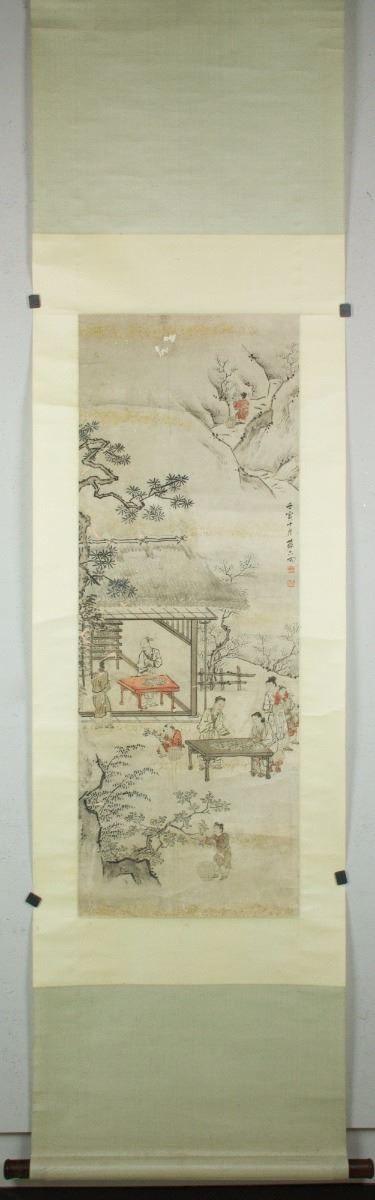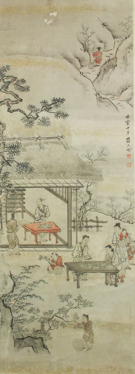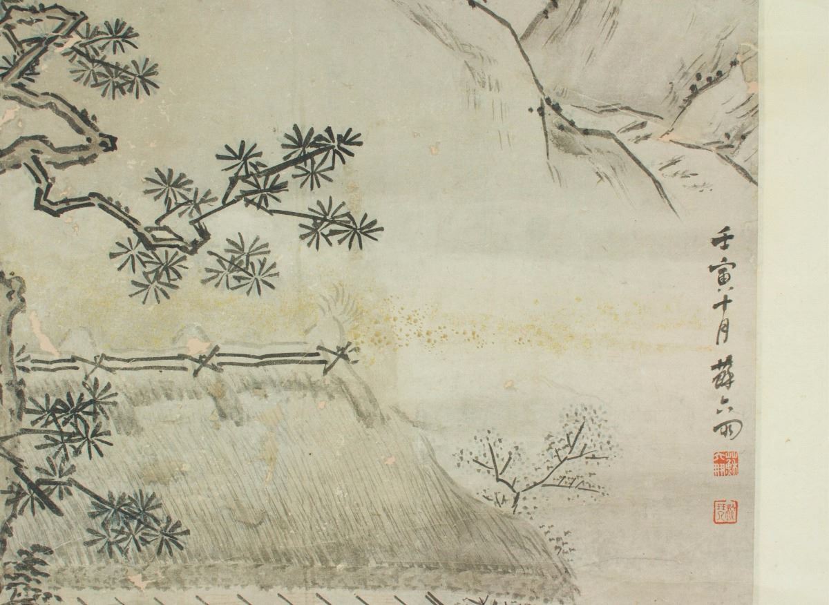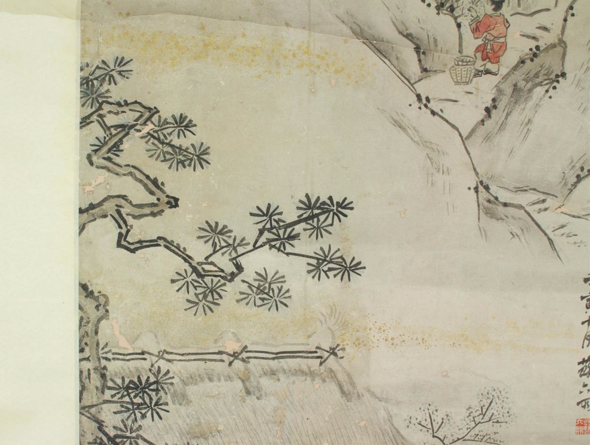 The scene of tea making in Landscape, hanging scroll, Chinese ink and watercolour on paper, signed and sealed by Su Liupeng. 114 cm X 42 cm.
