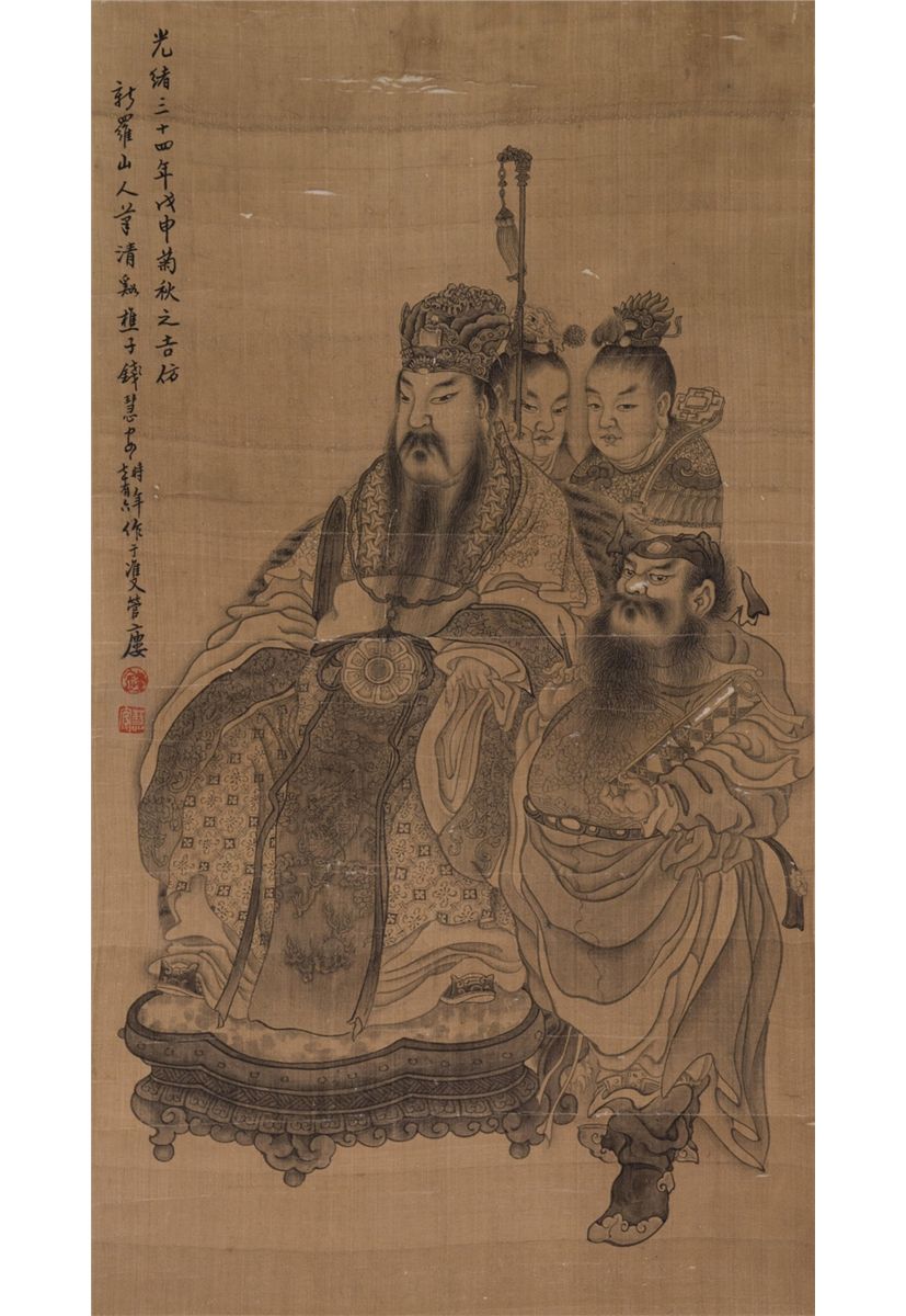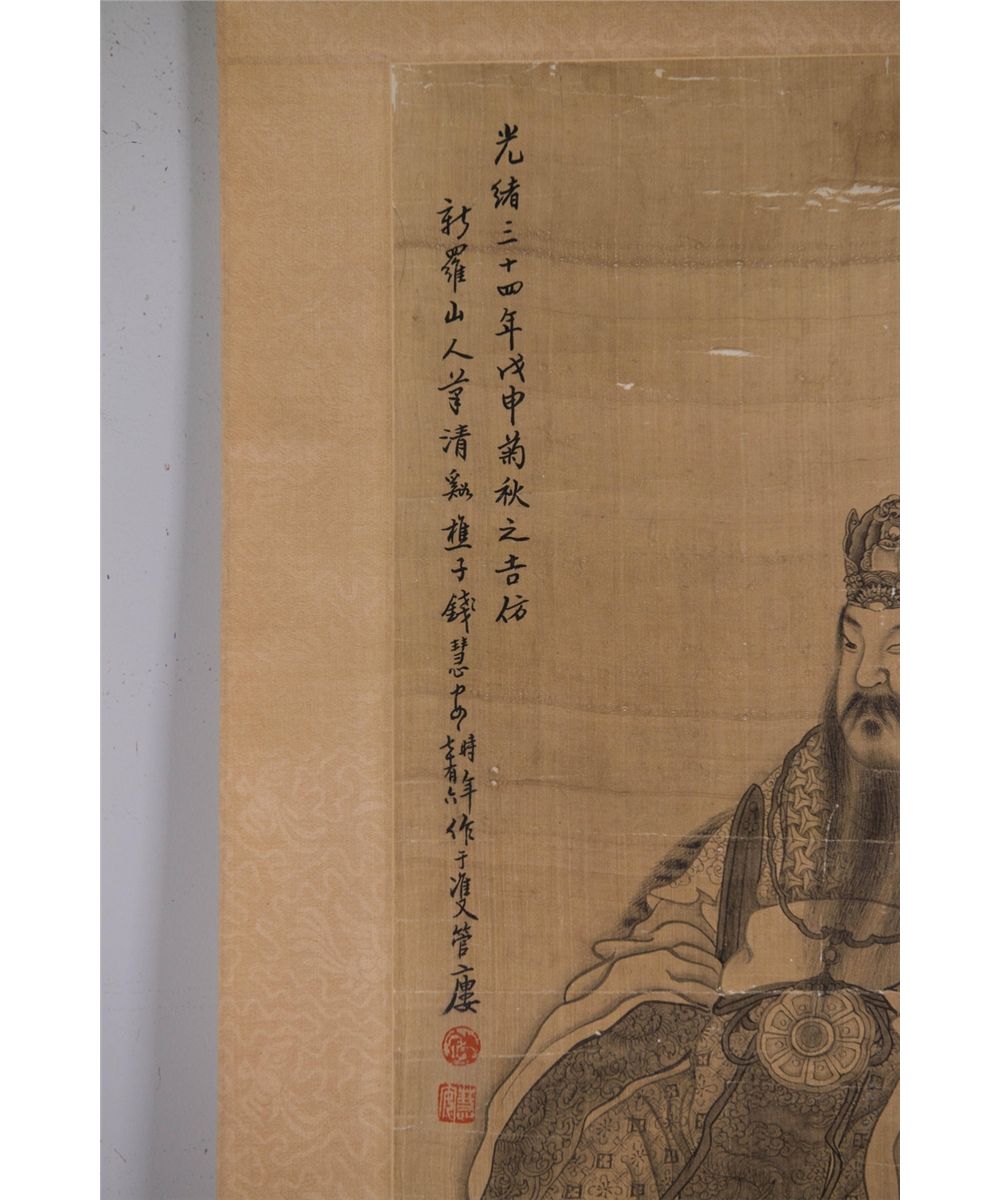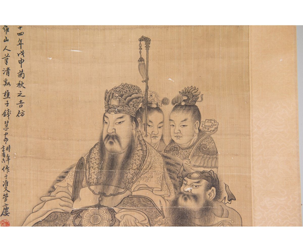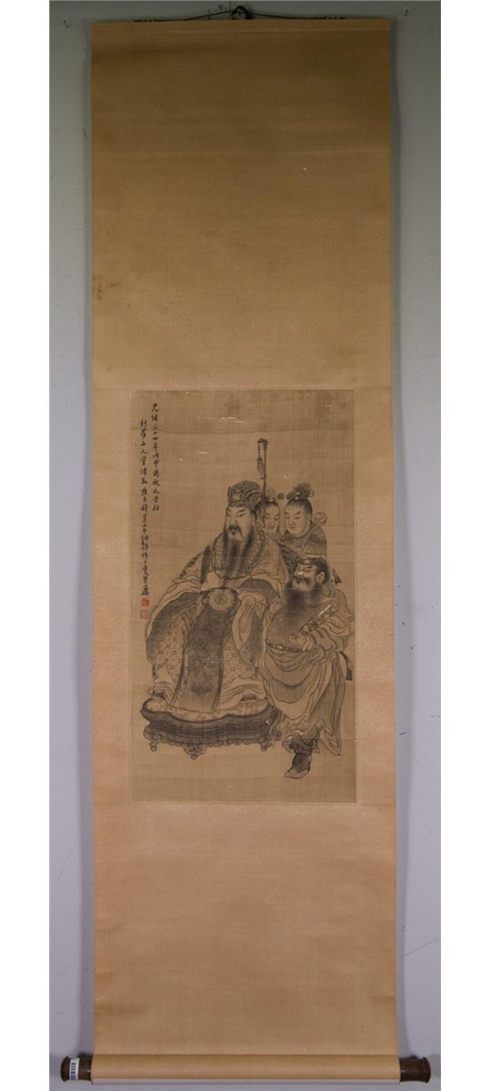 Line drawing of emperor and his followers; Chinese ink on silk; hanging scroll; signed Qian Huian (1833-1911) and inscribed with two artist seals; 63.5 cm x 35 cm