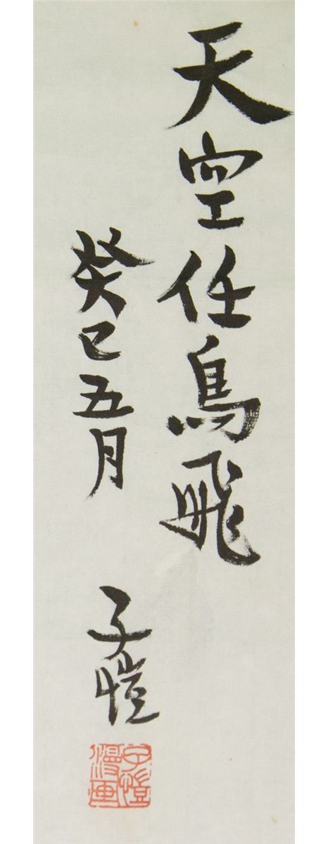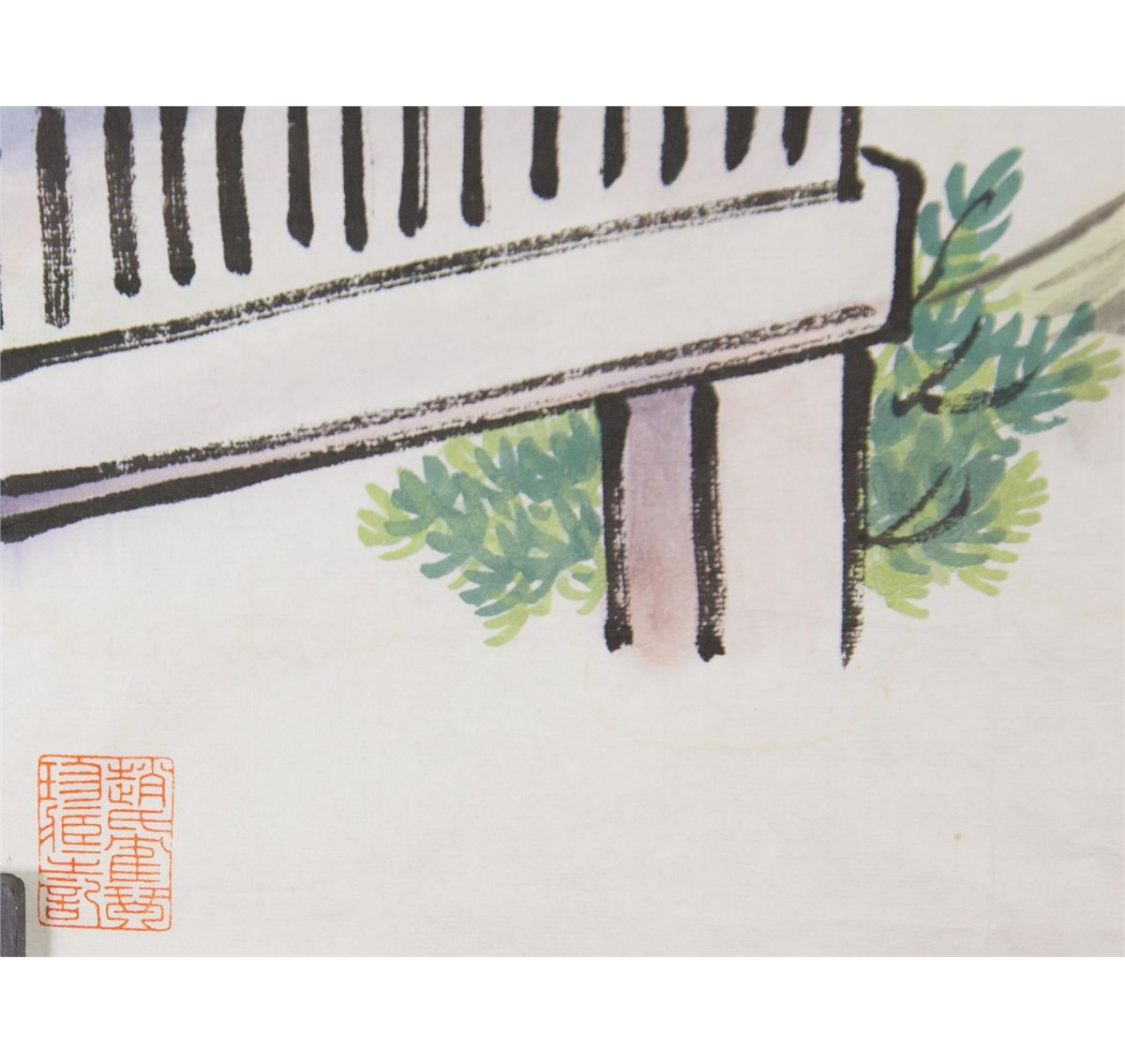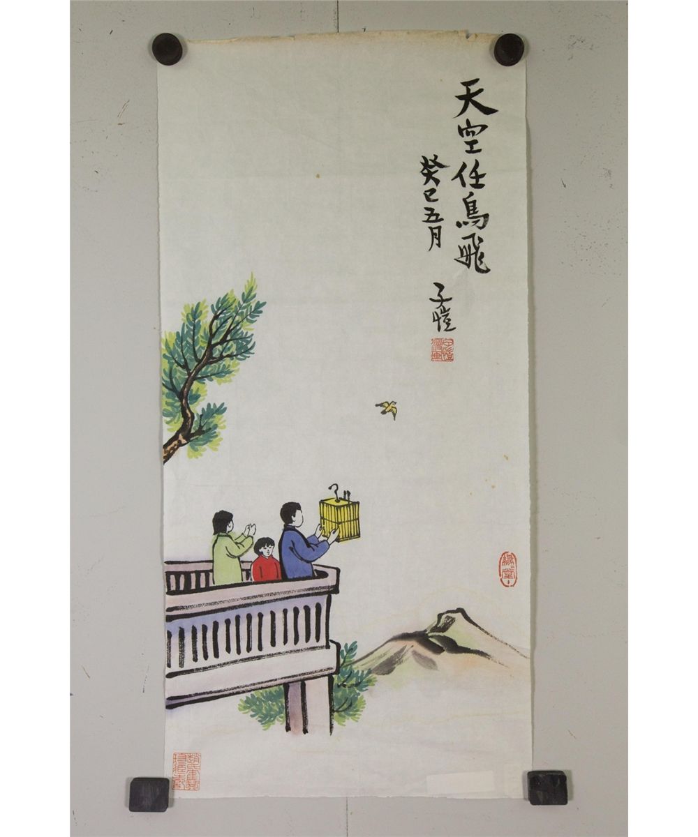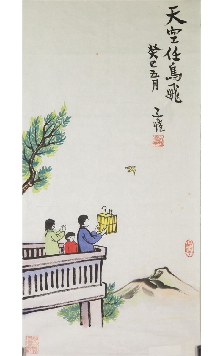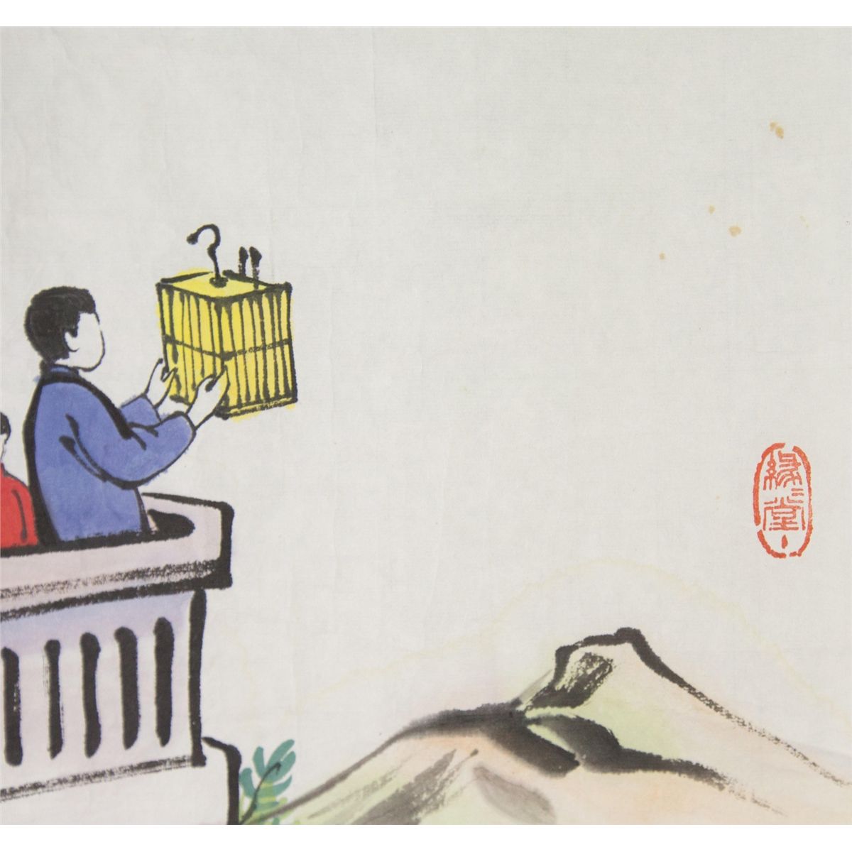 Figures freeing a bird from the cage; Chinese ink and watercolour on paper; signed Feng Zikai (1898-1975)and inscribed with three artist seals; 24.5 cm x 50 cm