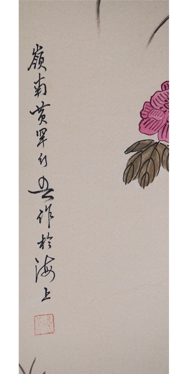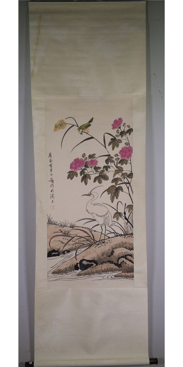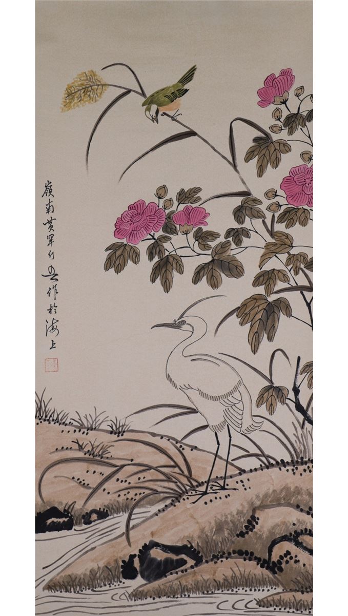 A crane and a bird surrounded by flowers; Chinese ink and watercolour on paper; hanging scroll; signed Huang Huanwu(1906 - 1985) and inscribed with one artist seal; 97 cm x 44 cm