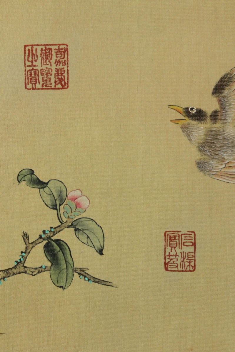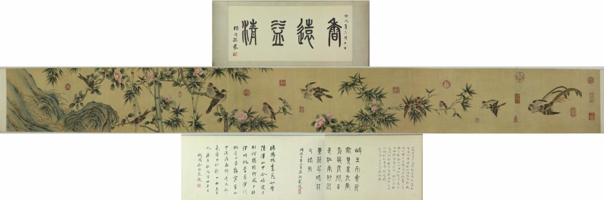 Flowers and birds; Chinese ink and watercolour on paper; hand scroll; signed Jiang Tingxi and inscribed with numerous artist seals; 25 cm x 55 cm, 59.5 cm x 279 cm