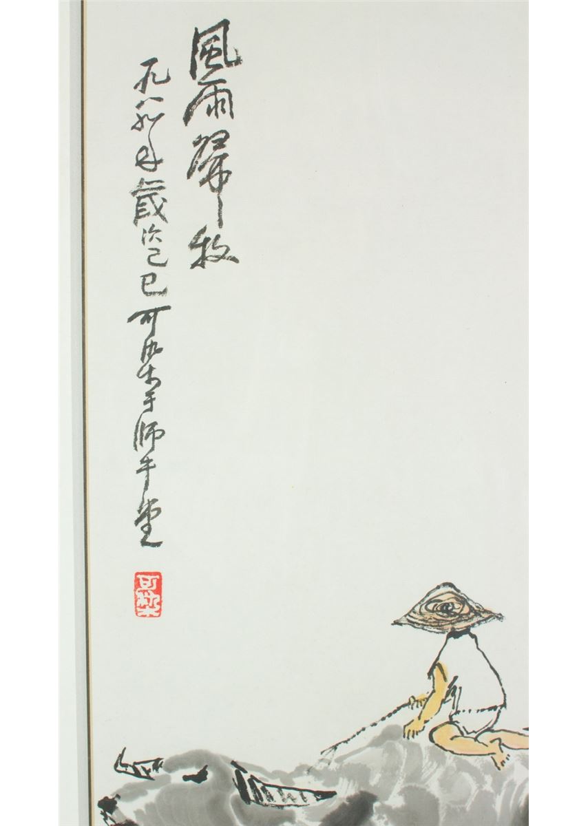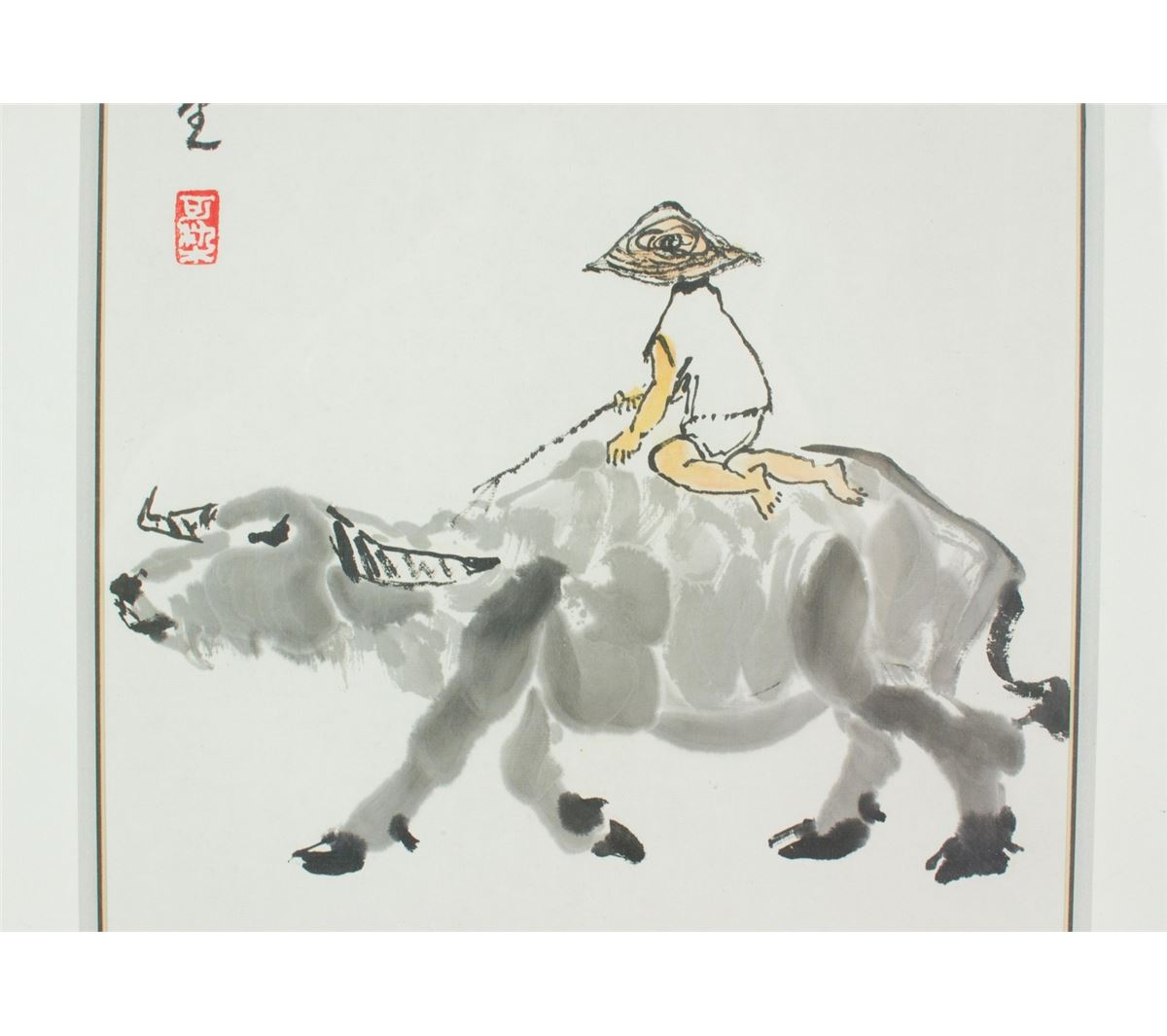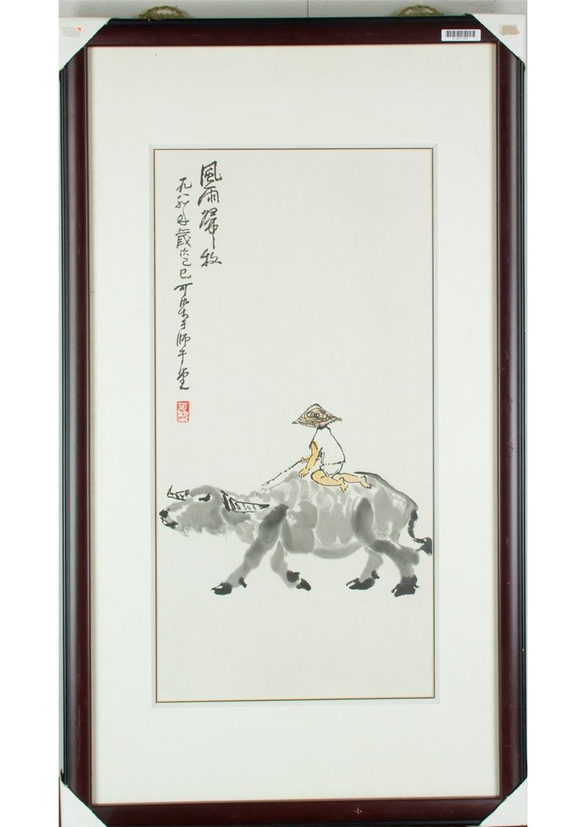 Cow and Boy, Chinese ink and watercolour on paper, framed, signed and sealed by Li Keran. 65 cm X 33 cm; 94 cm X 53 cm (with frame)