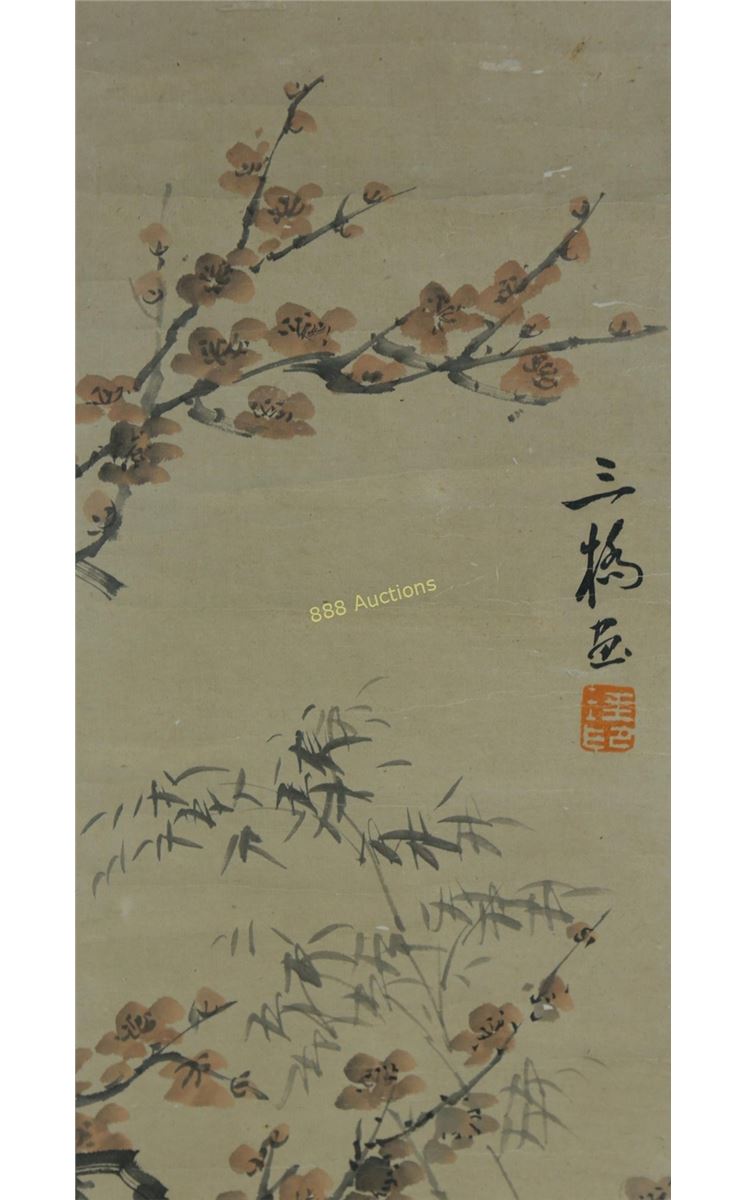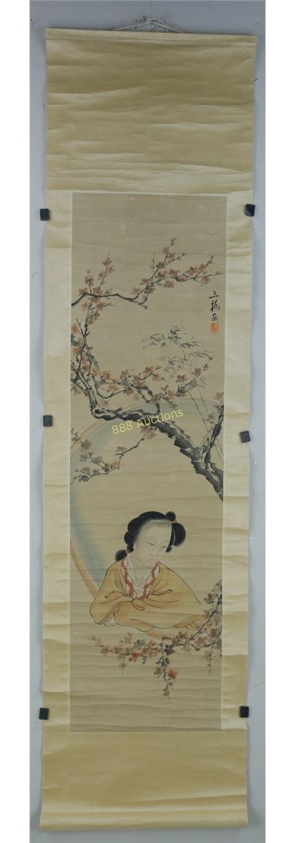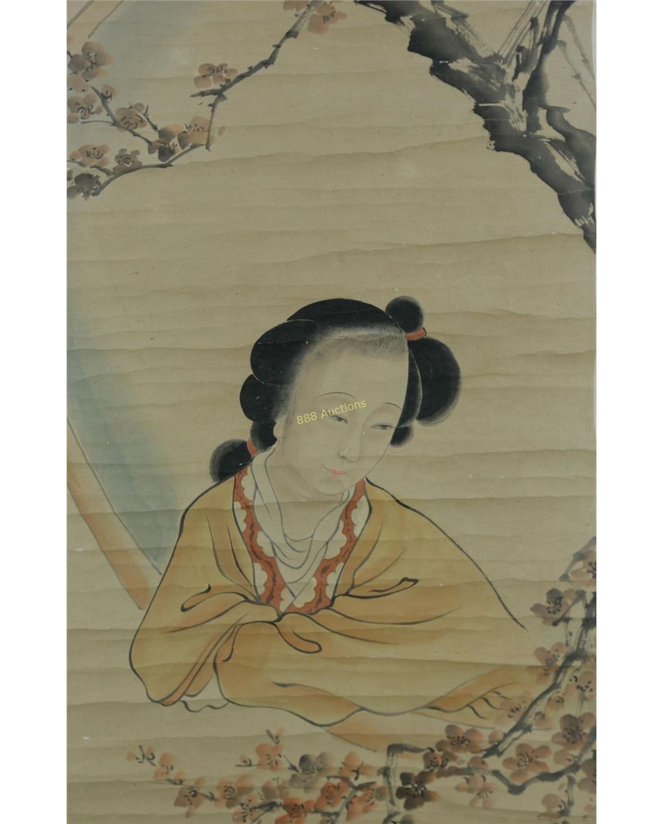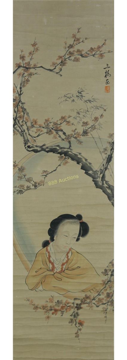 Beautiful lady under plum blossom tree; Chinese ink and watercolour on paper; hanging scroll; signed Hu Sanqiao and inscribed with one artist seal; 118 cm x 34 cm