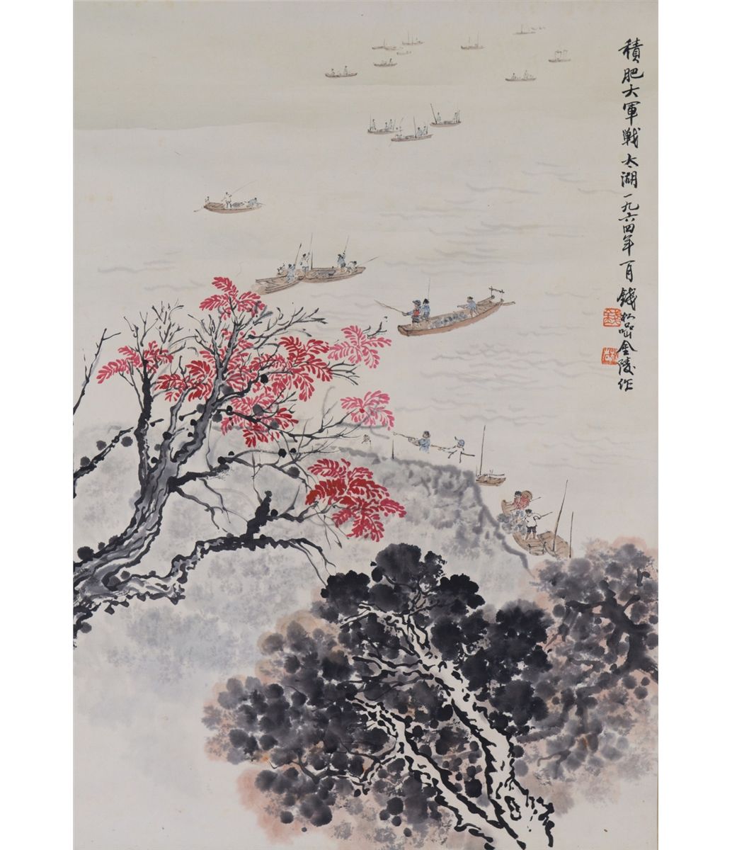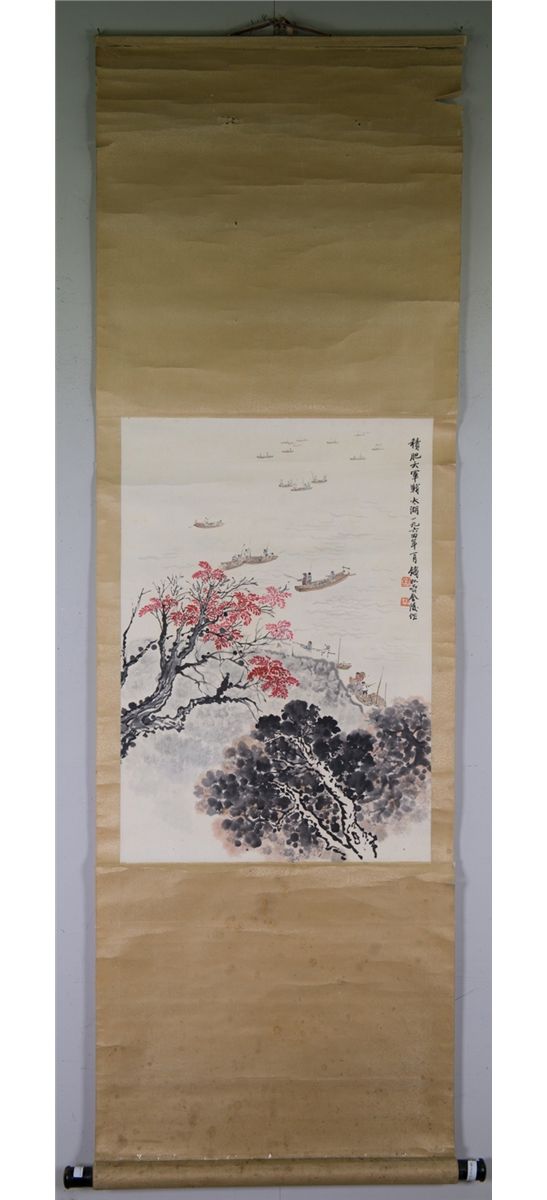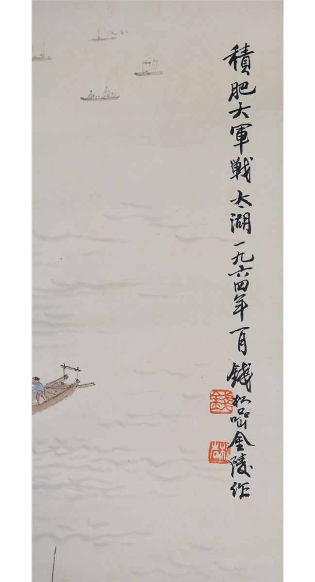 Landscape and figures; Chinese ink and watercolour on paper; hanging scroll signed Qian Songyan (1899-1985) and inscribed two artist seals; 67 cm x 47 cm