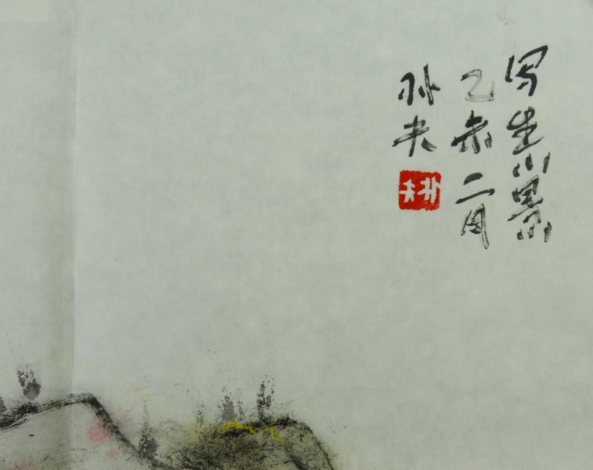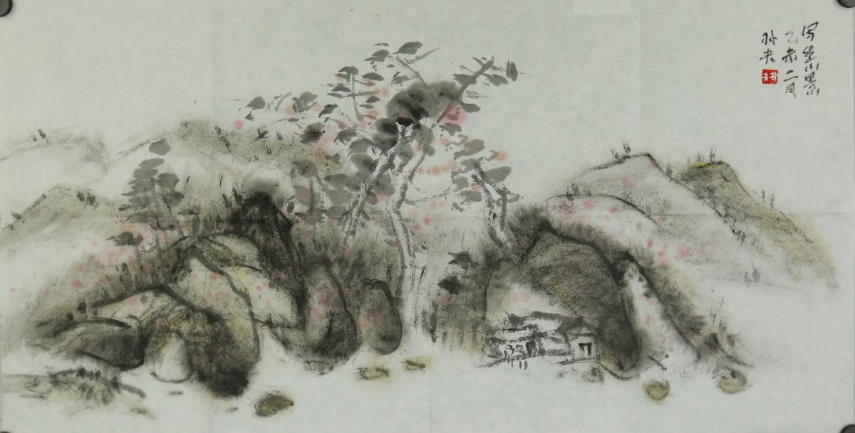 Village in hills; Chinese ink and watercolour on paper; signed Luo Pufu and inscribed with one artist seal; 34 cm x 65 cm