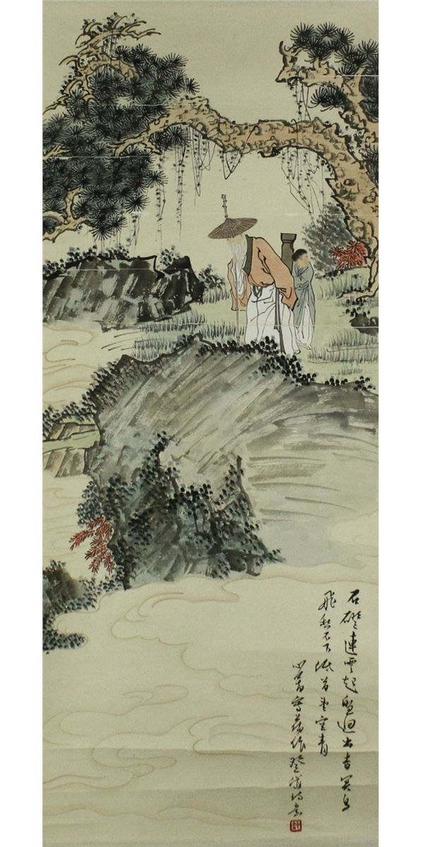 Figures and landscape; Chinese ink and watercolour on paper; hanging scroll; signed Puyi and inscribed with one artist seal; 91.5 cm X 37.5 cm