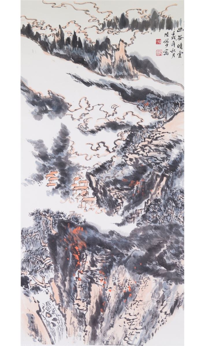 Deep valley with clouds; Chinese ink and watercolour on paper; signed Lu Yanshao (1909-1993) and inscribed with two artist seals; 100 cm x 48 cm