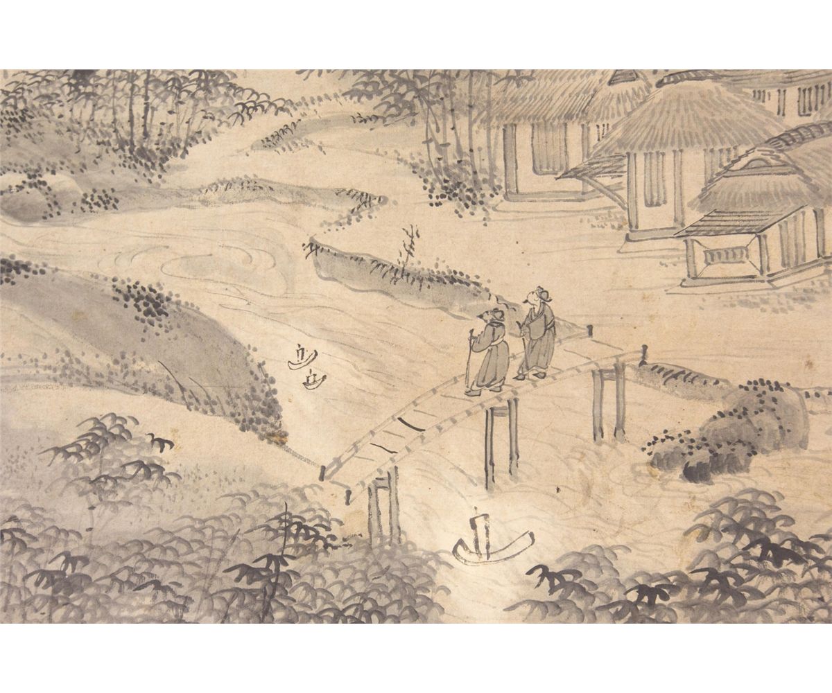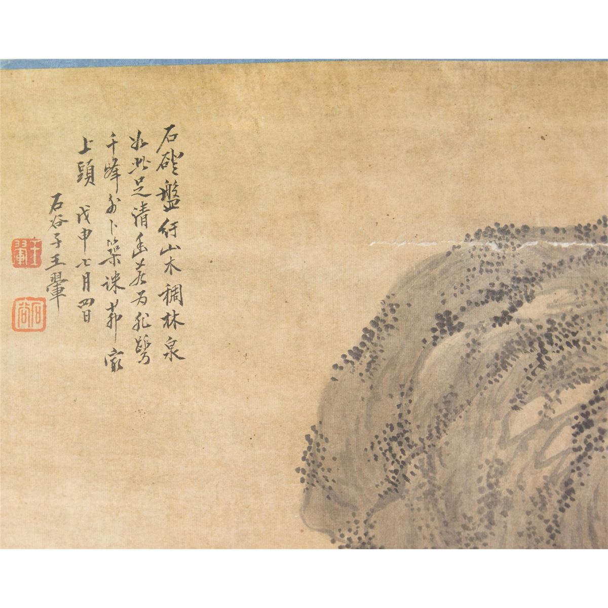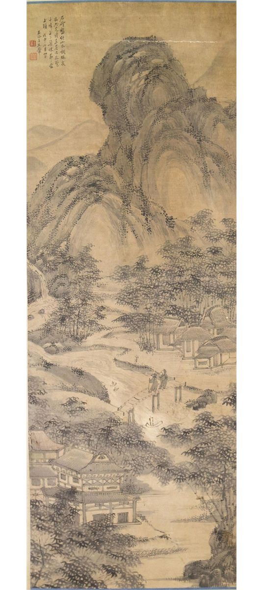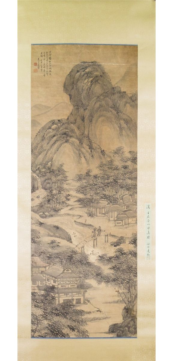 Landscape; Chinese ink and watercolour on paper; signed Wang Hui (1632-1717) and inscribed with two artist seals; 105 cm x 38 cm