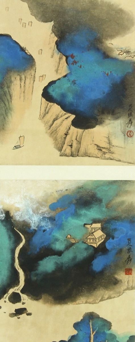 Splashed color (Pocai) style landscape; Chinese ink and watercolour on paper; hanging scroll; signed Zhang Daqian and inscribed with two artist seals; 30.5 cm X 25 cm each