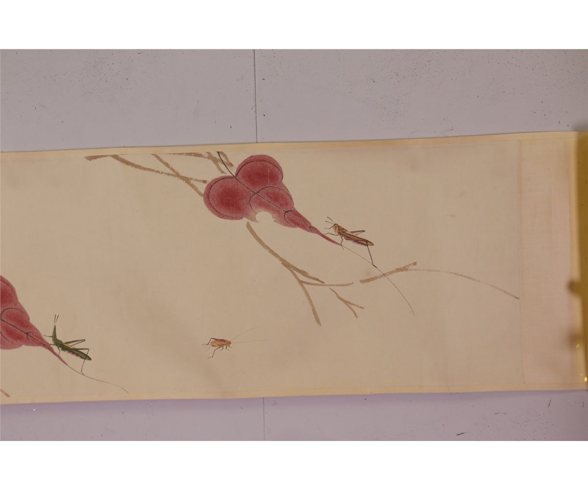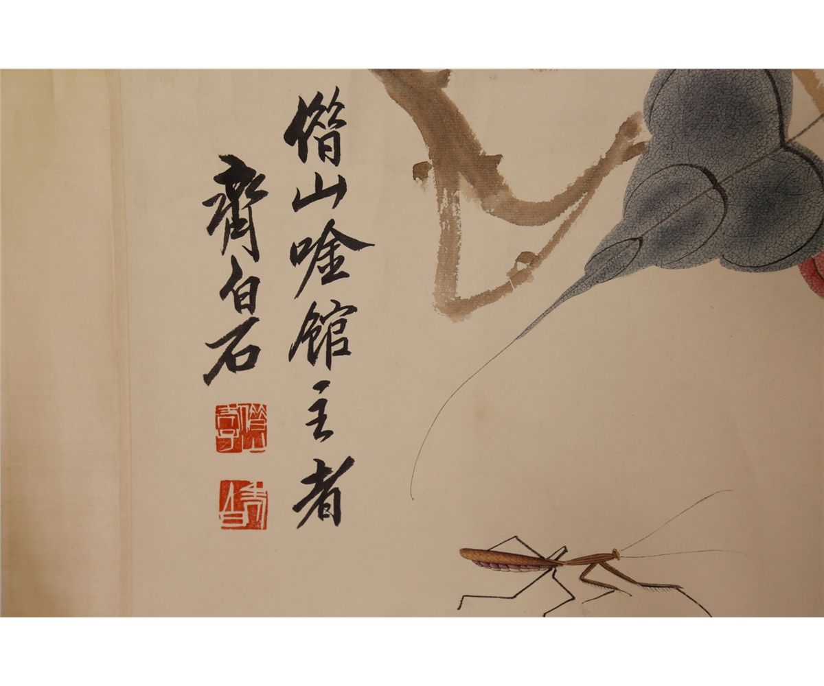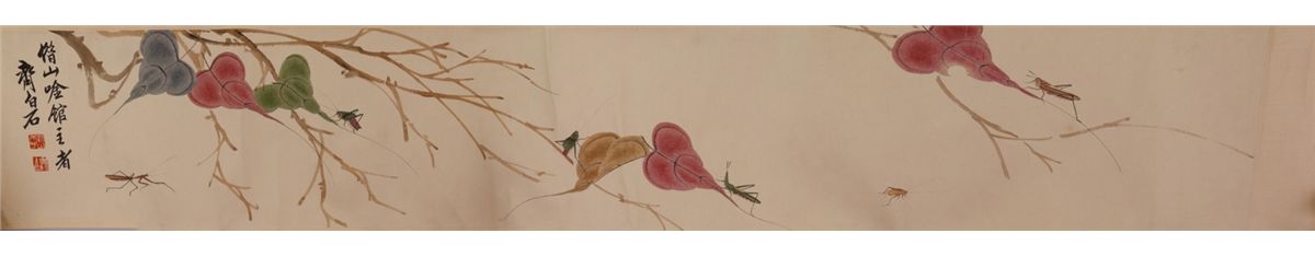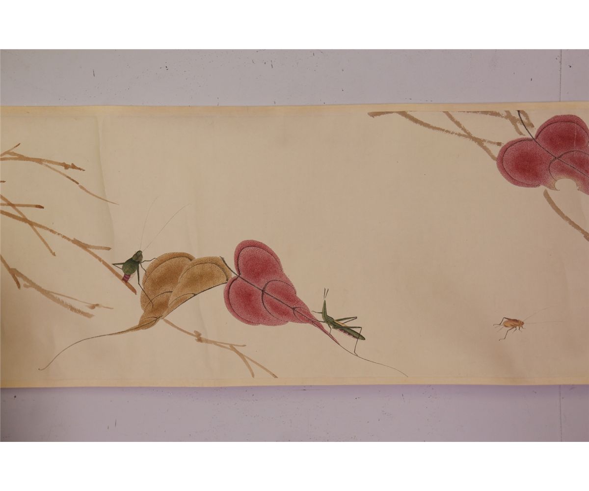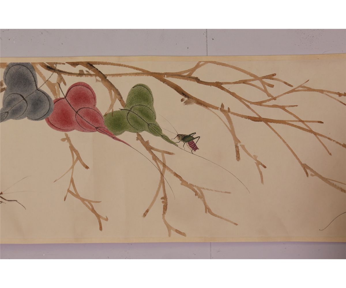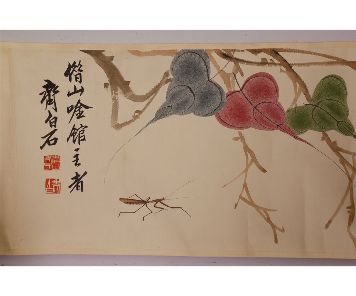 Leaves and mantis; Chinese ink and watercolour on paper; hand scroll; Attributed to Qi Baishi and inscribed with two artist seals; 177 cm x 29 cm