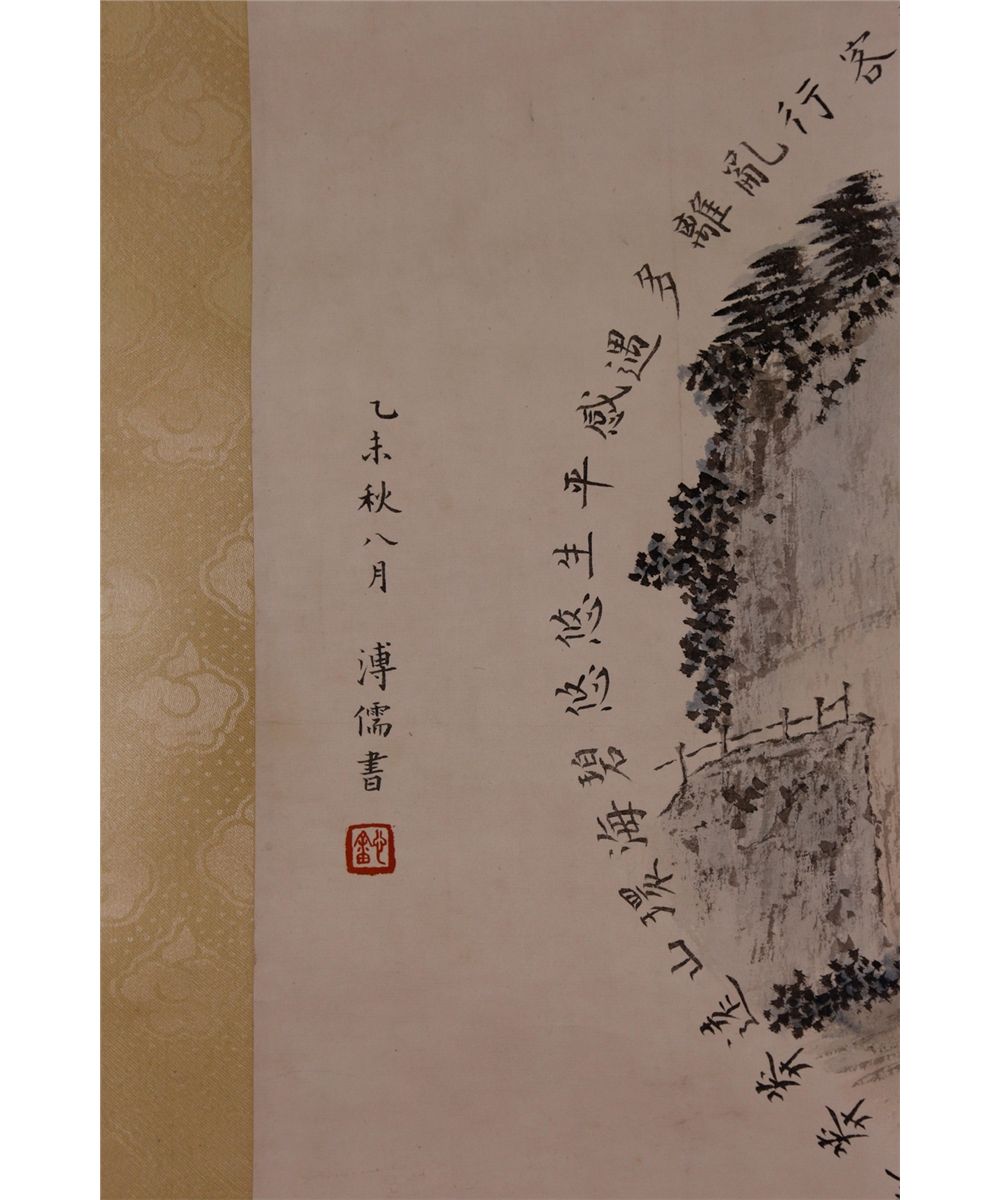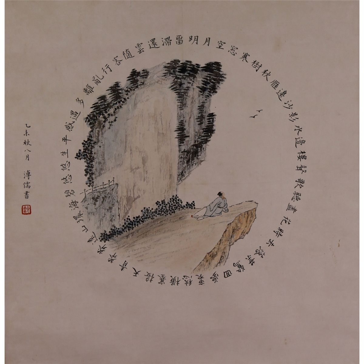 Figures and landscape with script calligraphy; Chinese ink and watercolour on paper; hanging scroll; signed Fu Xinfan and inscribed with one artist seal; 47 cm x 49 cm