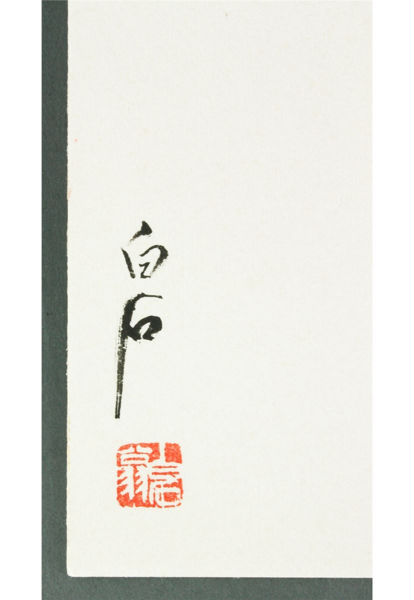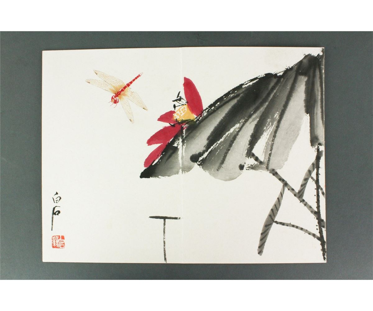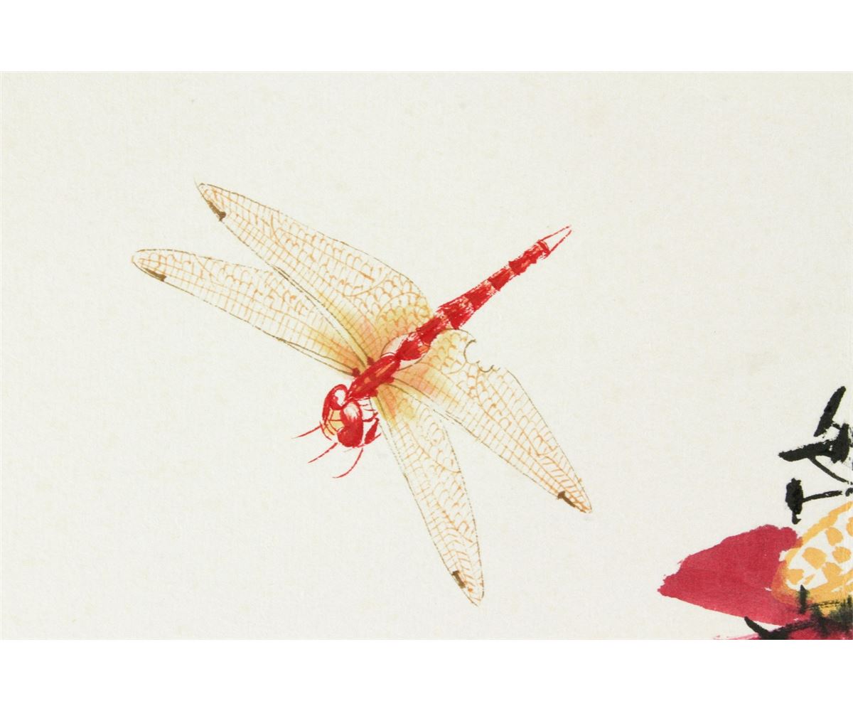 Dragonfly and lotus seedpod; Chinese ink and watercolour on paper; signed Qi Baishi and inscribed with one artist seal; 16 cm x 24 cm