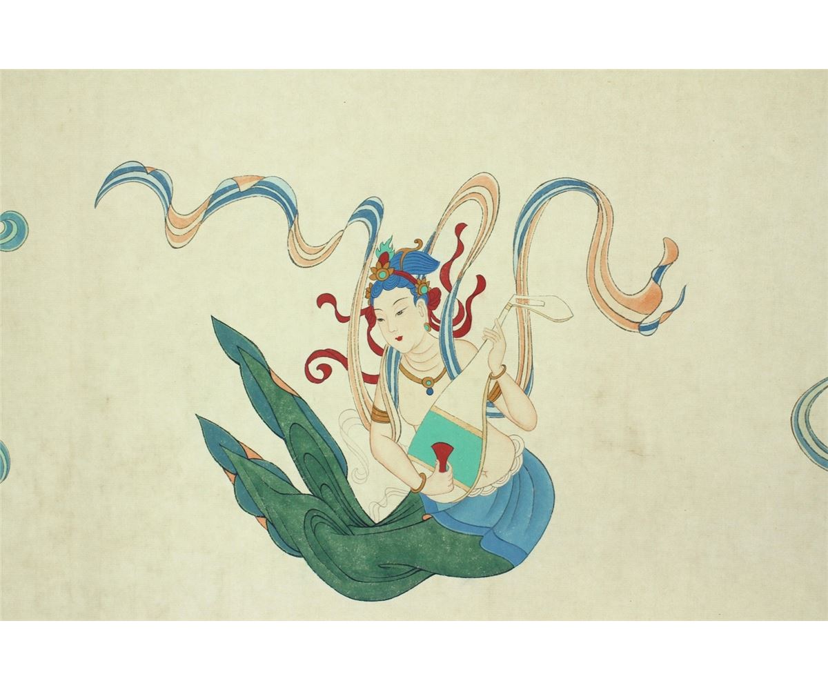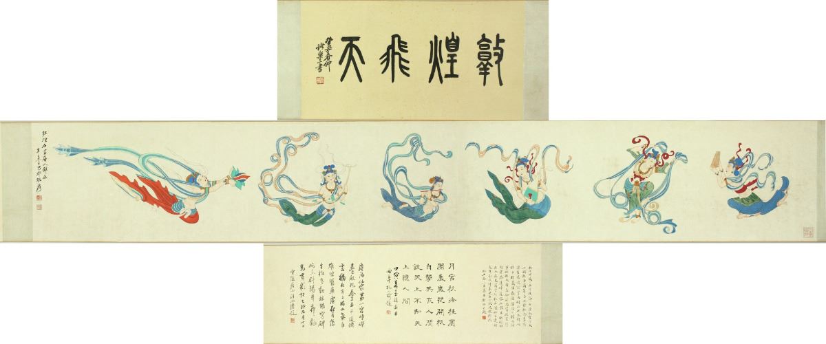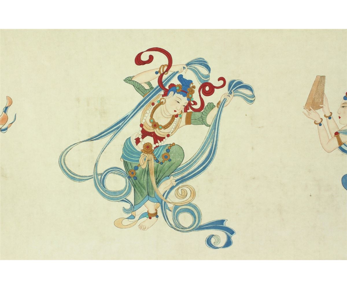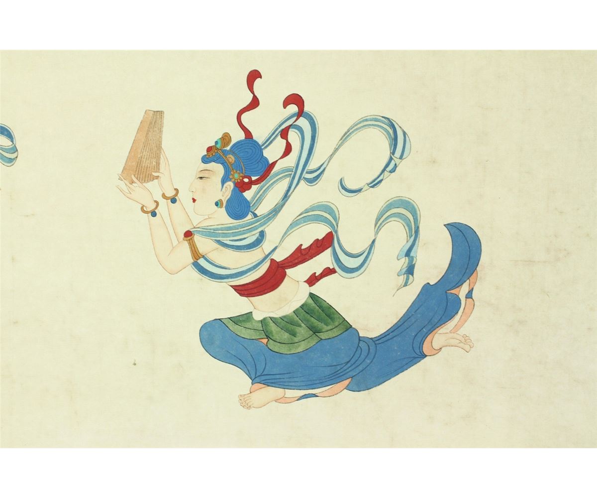 Feitian aspara; Chinese ink and watercolour on paper; hand scroll; signed Zhang Daqian and inscribed with three artist seals; 35 cm x 65 cm; 35 cm x 230 cm