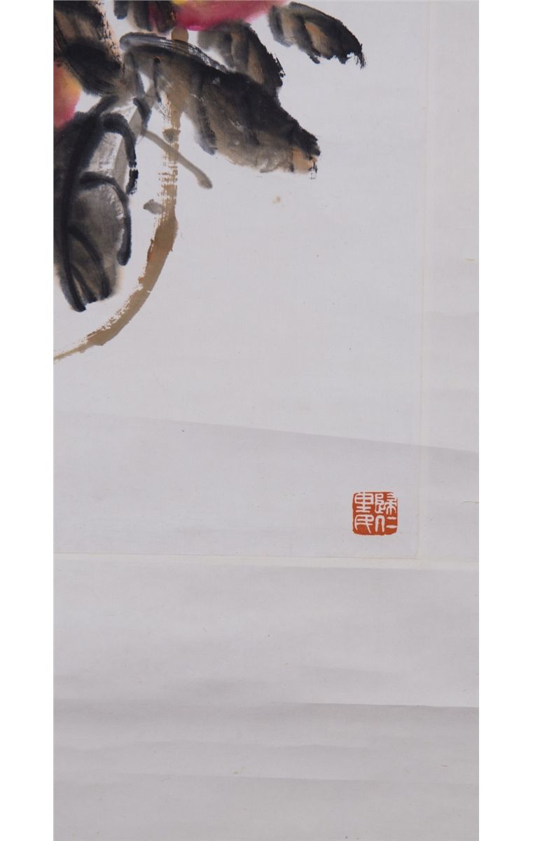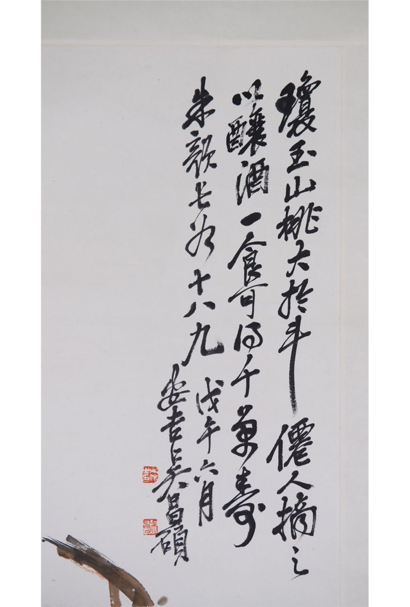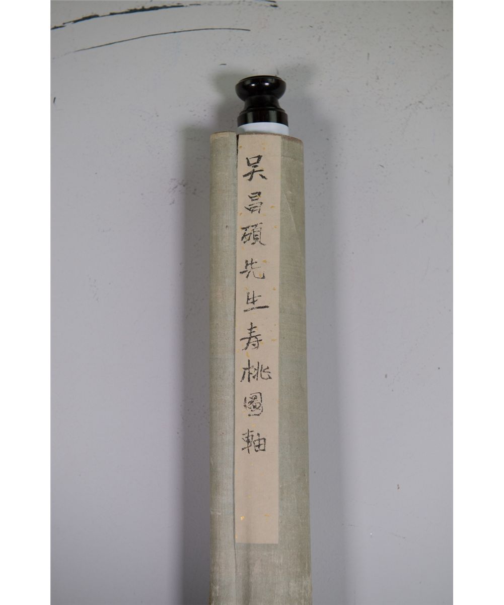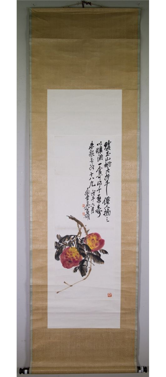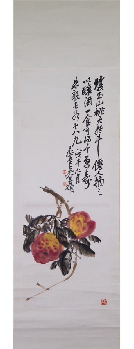 Two peaches; Chinese ink and watercolour on paper; hanging scroll; signed Wu Changshuo (1844-1927) and inscribed with three artist seals; 85 cm x 31 cm