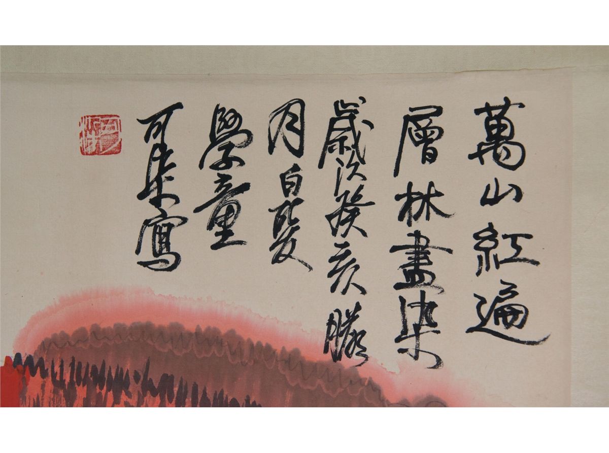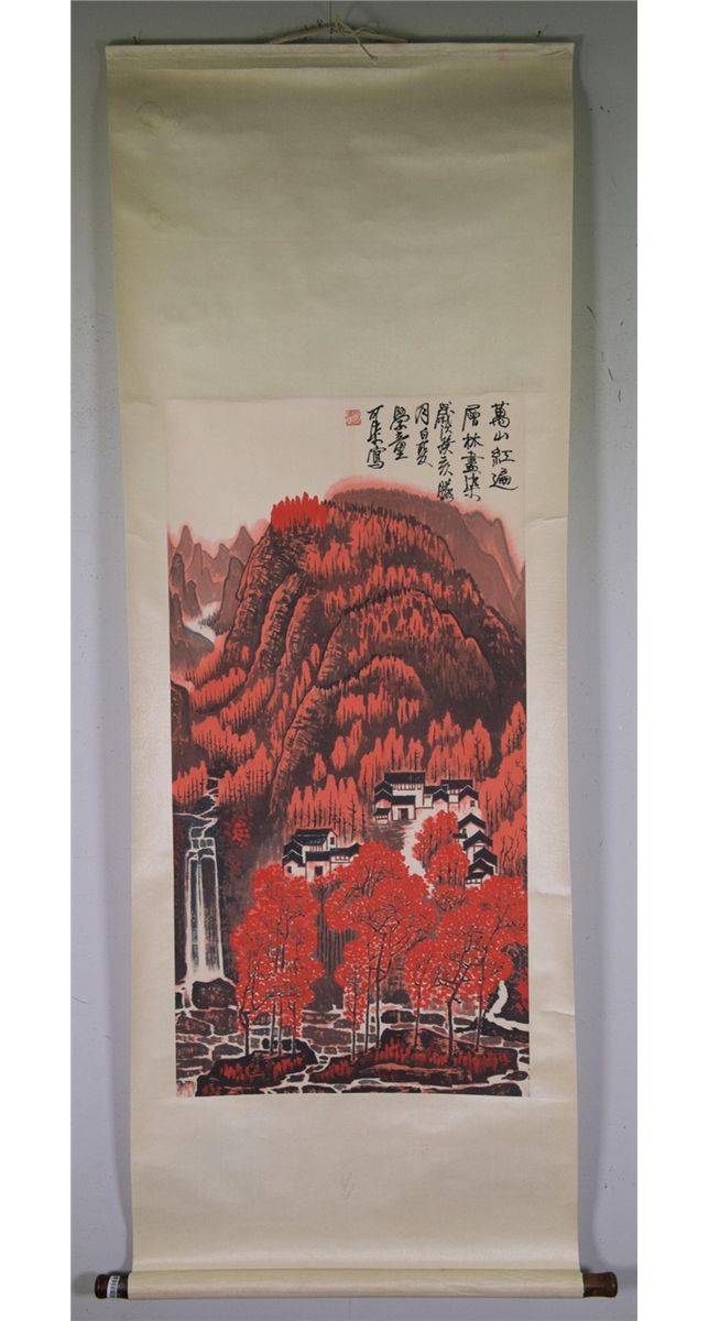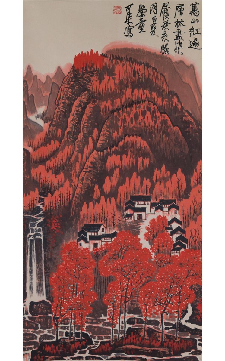 Red village scene; Chinese ink and watercolour on paper; hanging scroll; signed Li Keran (1907-1989) and inscribed with one artist seal; 93 cm x 48 cm