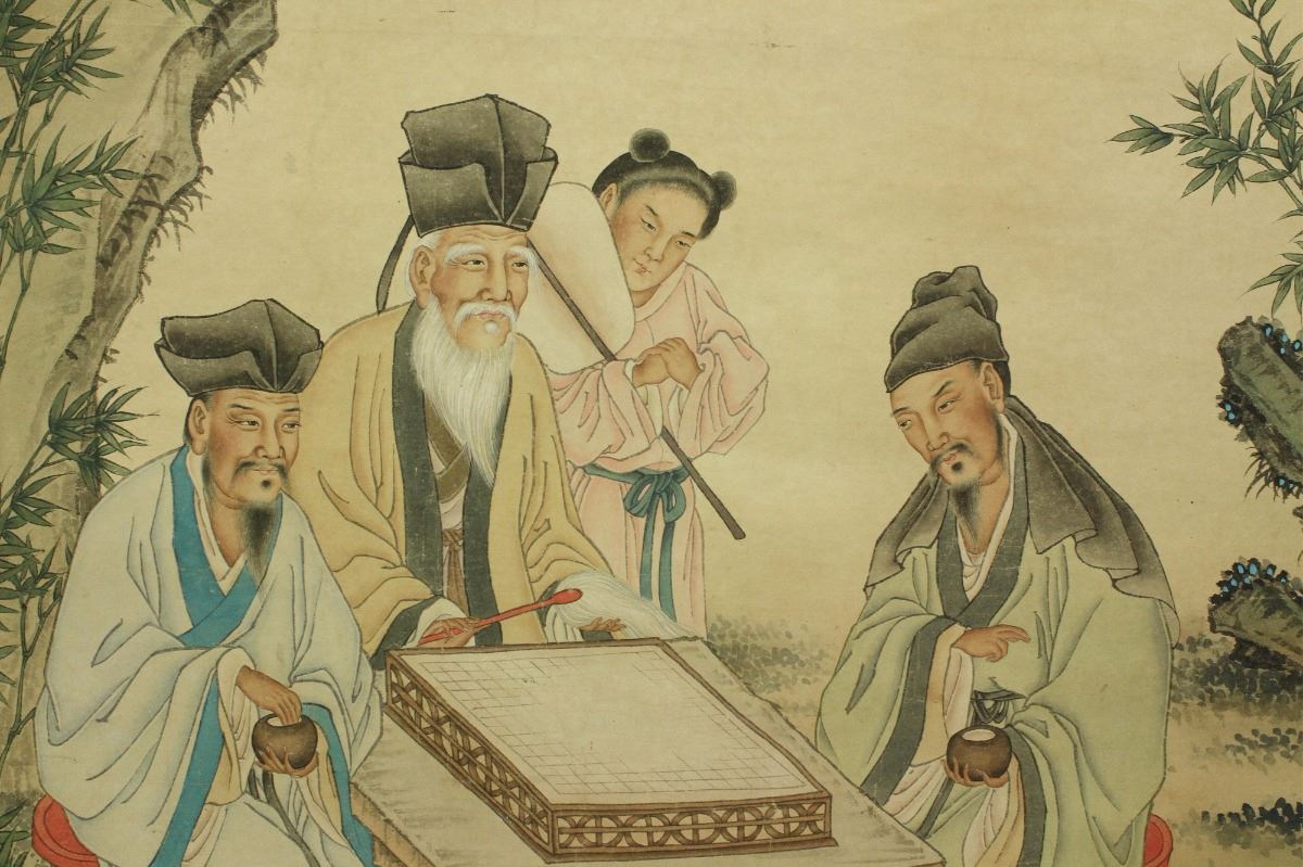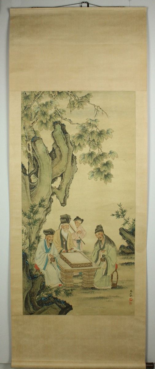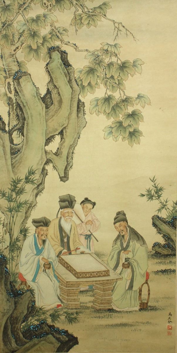 Scholars playing Go game; Chinese ink and watercolour on paper; hanging scroll; signed Ma Yuanyu and inscribed with two artist seals; 131 cm X 65 cm