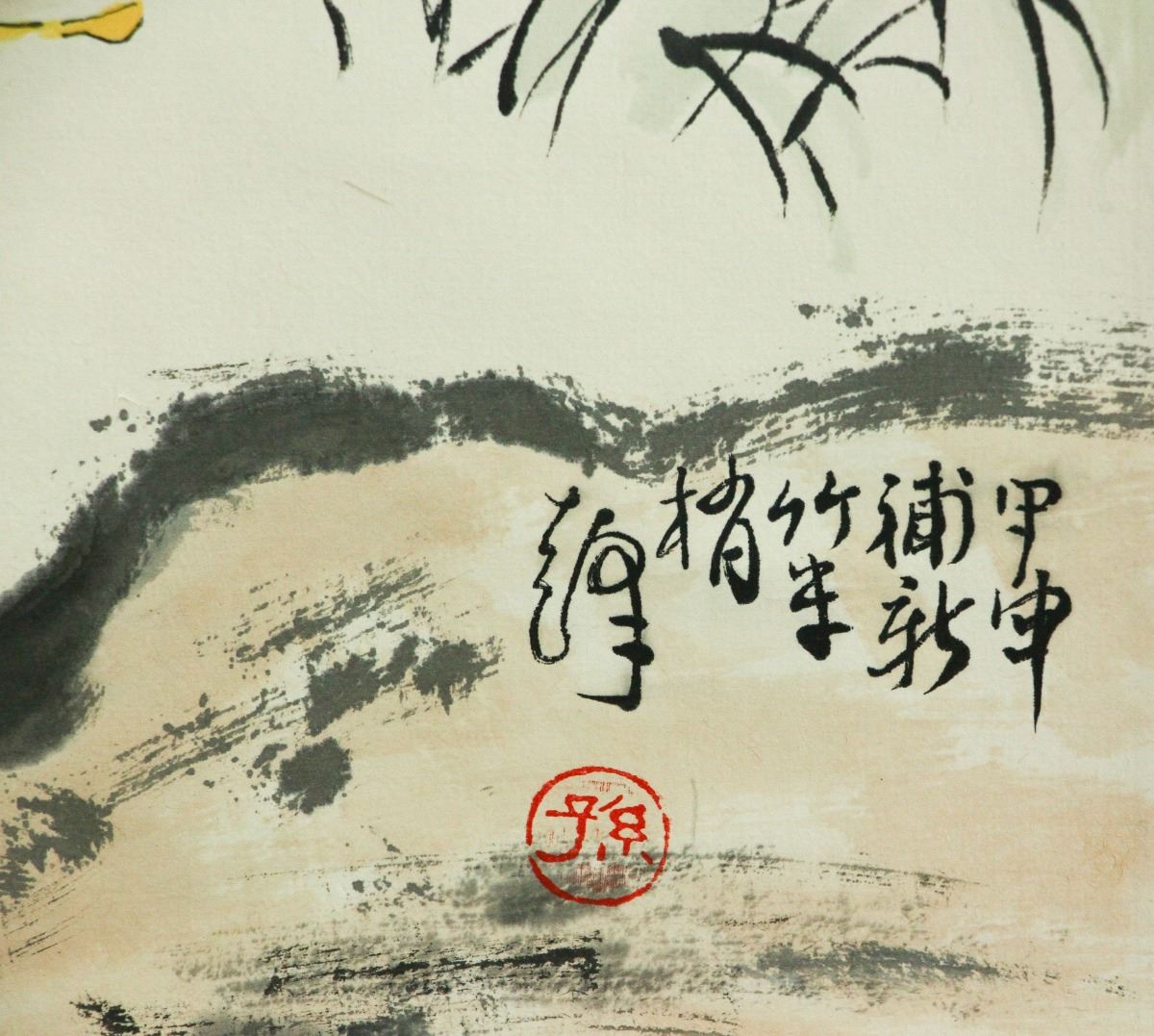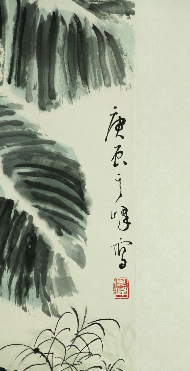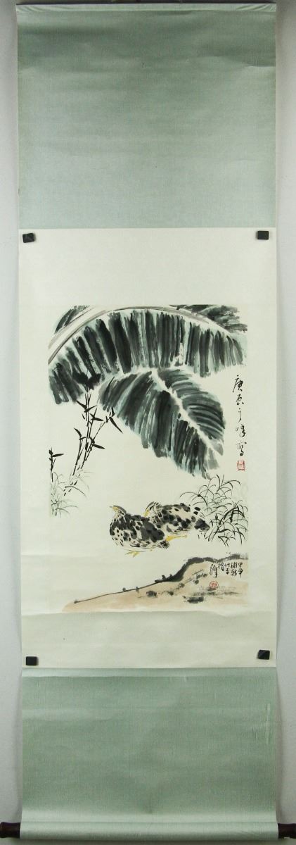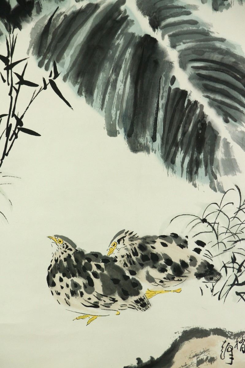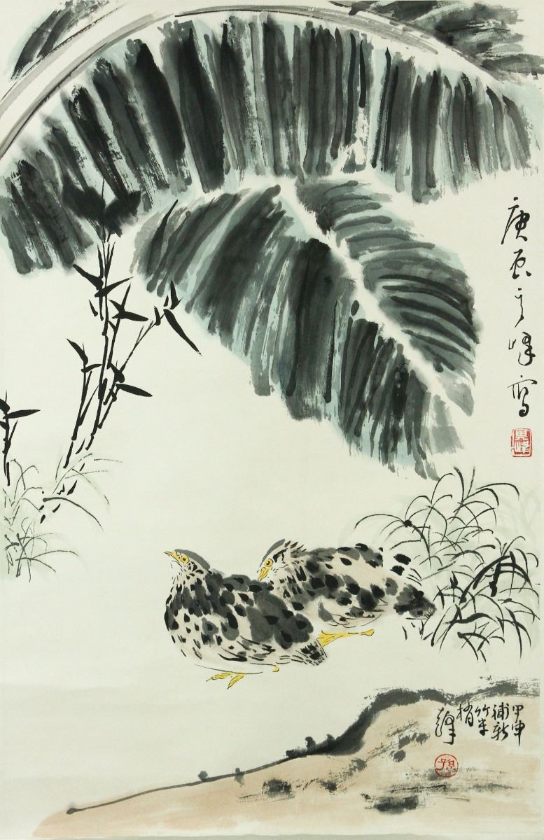 A pair of quails under banana leaves; Chinese ink and watercolour on paper; hanging scroll; signed Sun Qifeng and inscribed with two artist seals; 185 cm X 58 cm