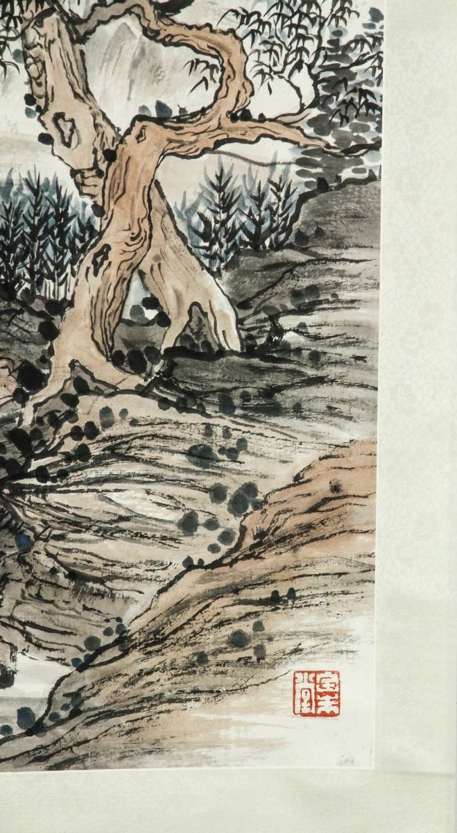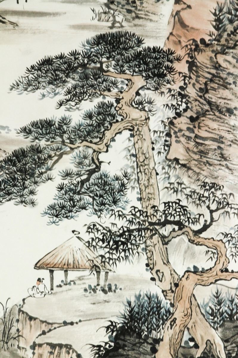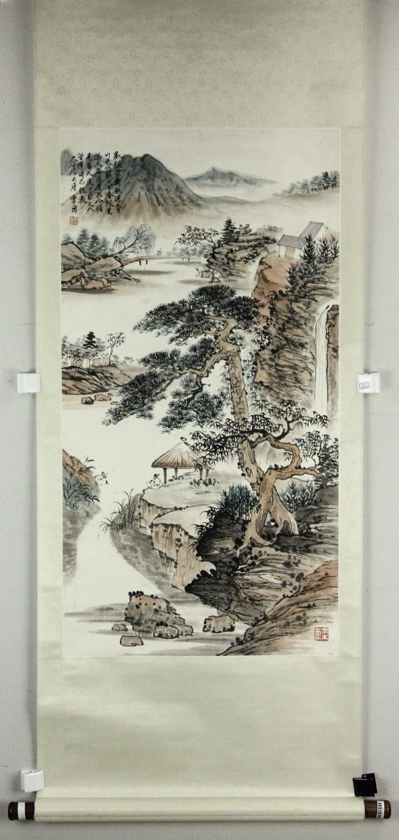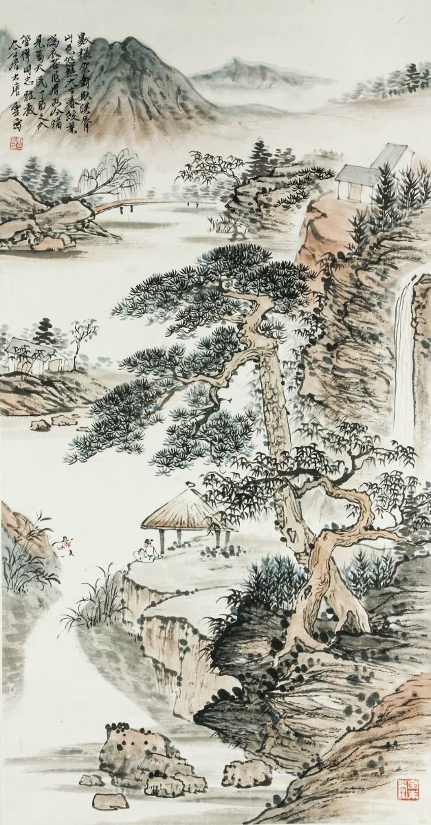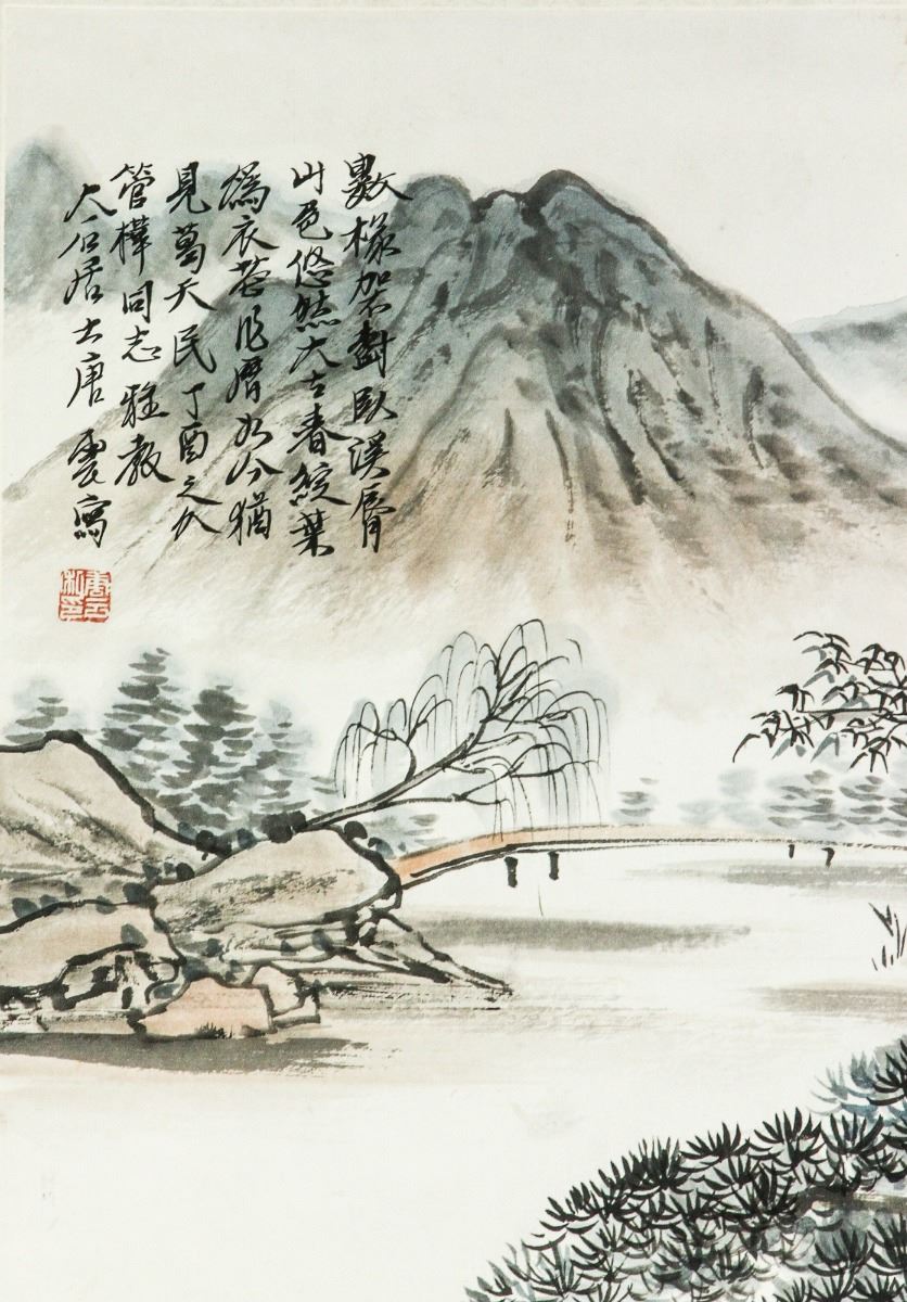 Village scenery along with script calligraphy; Chinese ink and watercolour on paper; hanging scroll; signed Tang Yun and inscribed with two artist seals; 98.5 cm X 52 cm