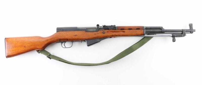 Chinese made semiautomatic rifle, imported by WTC, Birmingham AL. Features approx 20" barrel, protected post front & tangent rear sights, folding spike bayonet, fixed 10 round magazine, cleaning rod under barrel, butt compartment with cleaning kit, sling swivels, manual safety. Bore is very good condition, appears hard chrome lined. Metal parts retain 90% dark bluing, with scratches, thinning at sharp edges. Bayonet spike, bolt and carrier are matte light gray (appear hard chromed) with bright texture on bayonet spike. Stock is very good condition, with dents & blemishes throughout. All observed numbers match except stock. Marked "26" in triangle on receiver left side. Includes very good green cotton web sling (appears Chinese made for SKS). Condition is NRA Good++ *** Modern Firearm ***