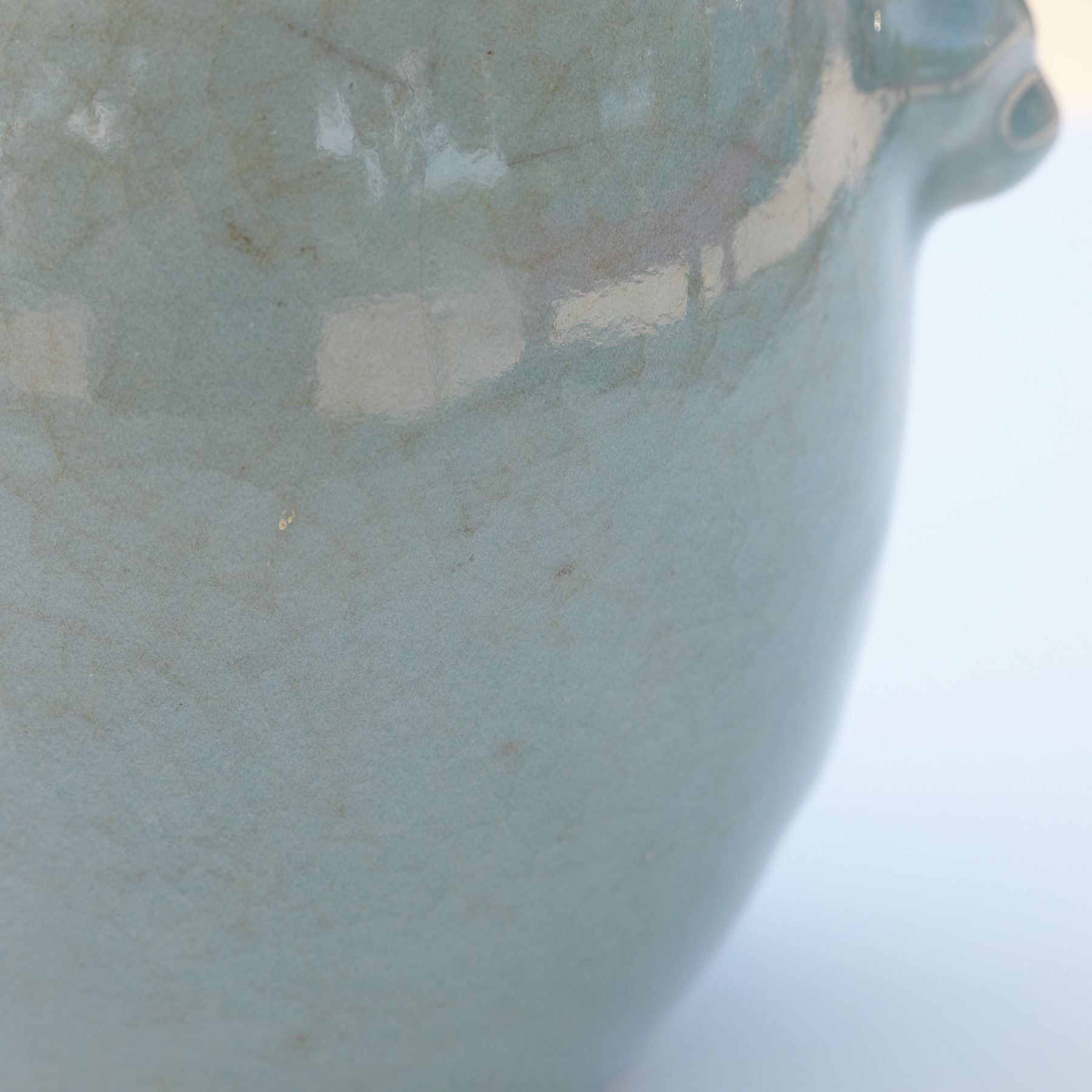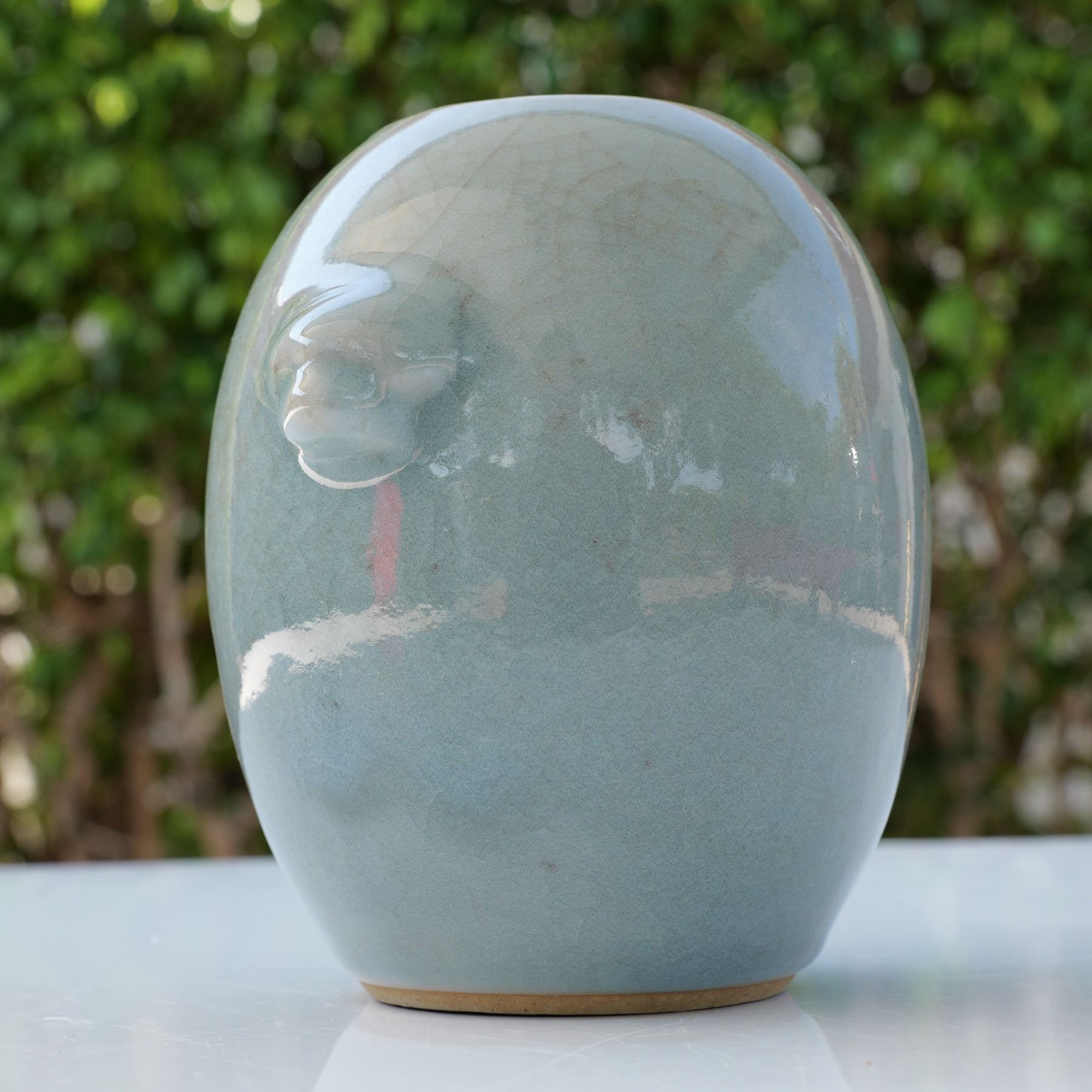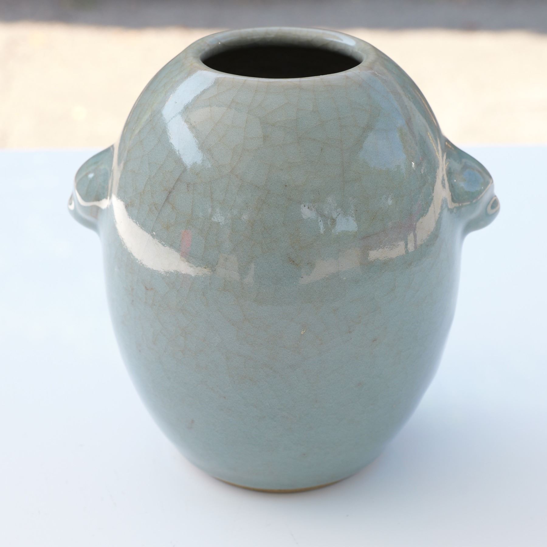 Ceramic vase featuring a blue celadon glaze with a distinct crackle throughout the surface. The body of the vase is ovoid with a rounded shoulder tapering slightly to a flat base. The vase is fitted with two short lug handles symmetrically positioned on opposite sides of the upper shoulder. Each handle is sculpted to resemble a stylized animal face with subtle protuberances representing snout. The base is unglazed around the foot ring, exposing the stoneware body in a buff tone with central glazed interior recess.