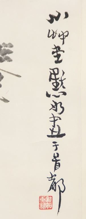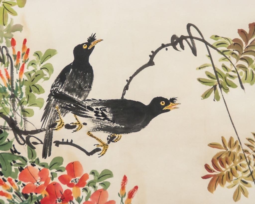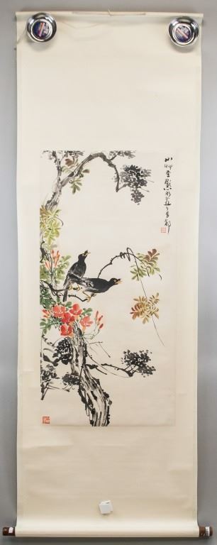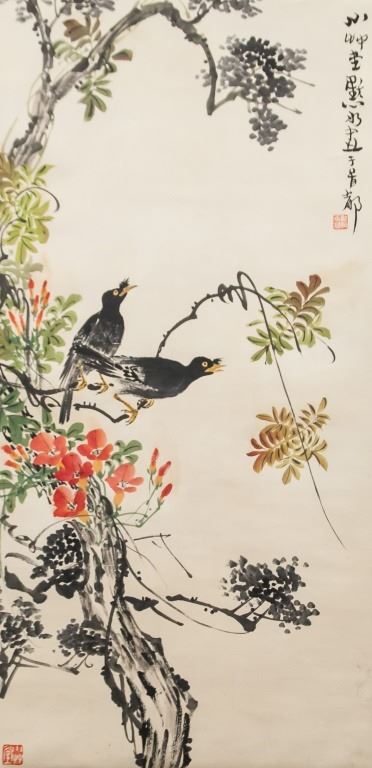 Ink and watercolor on paper, hanging scroll. Featuring birds and flowers. Signed Mo He, inscribed with 2 artist seals. 97 x 48 cm