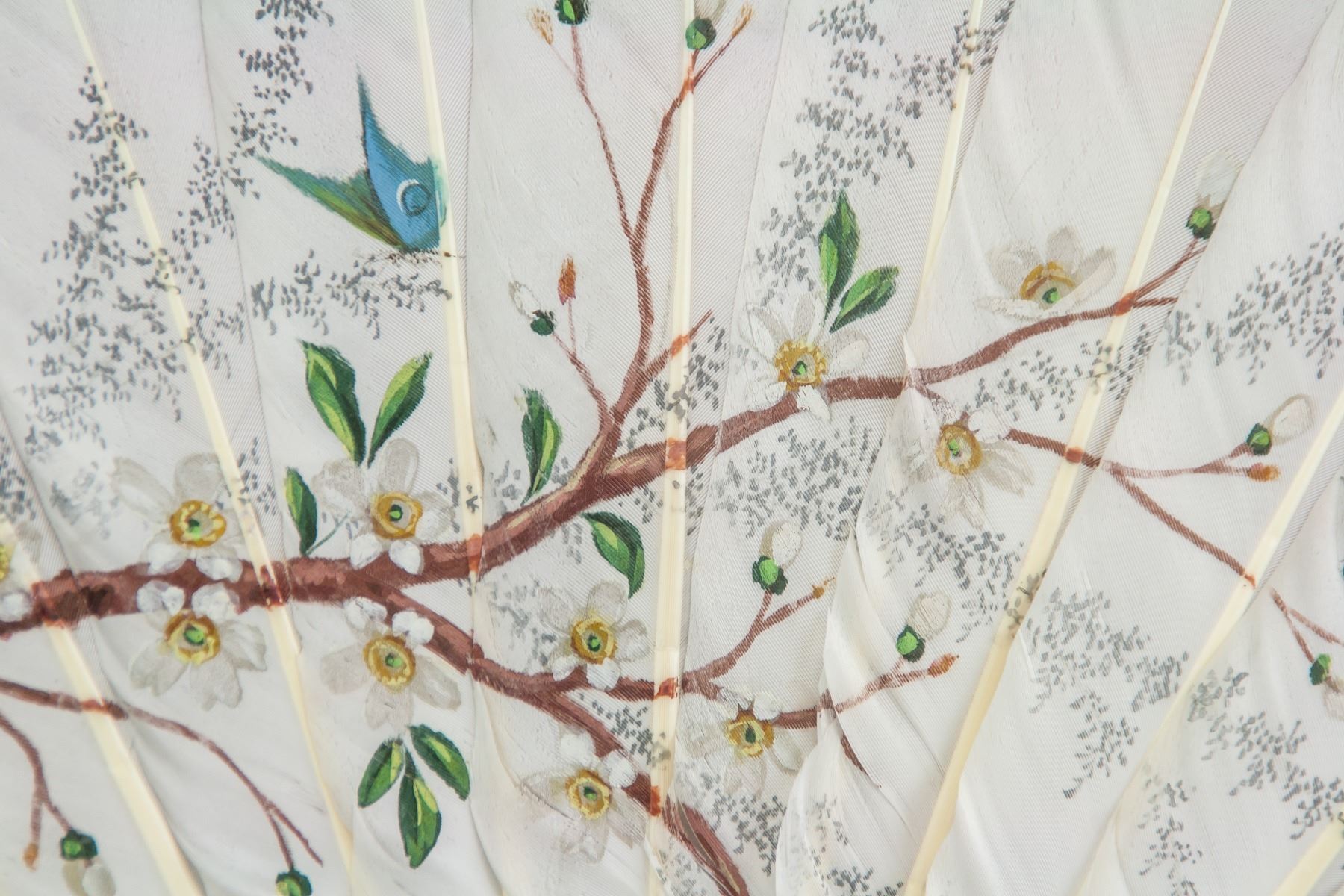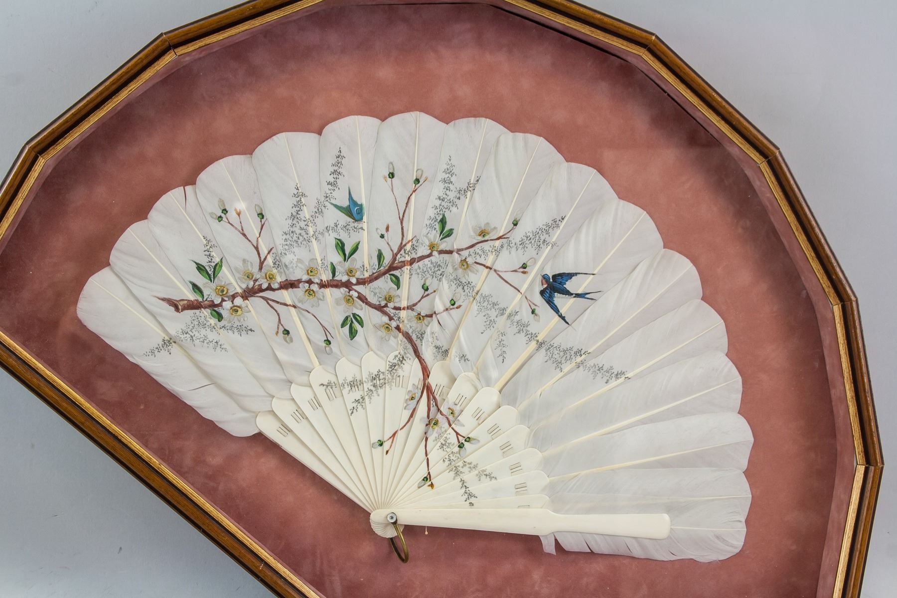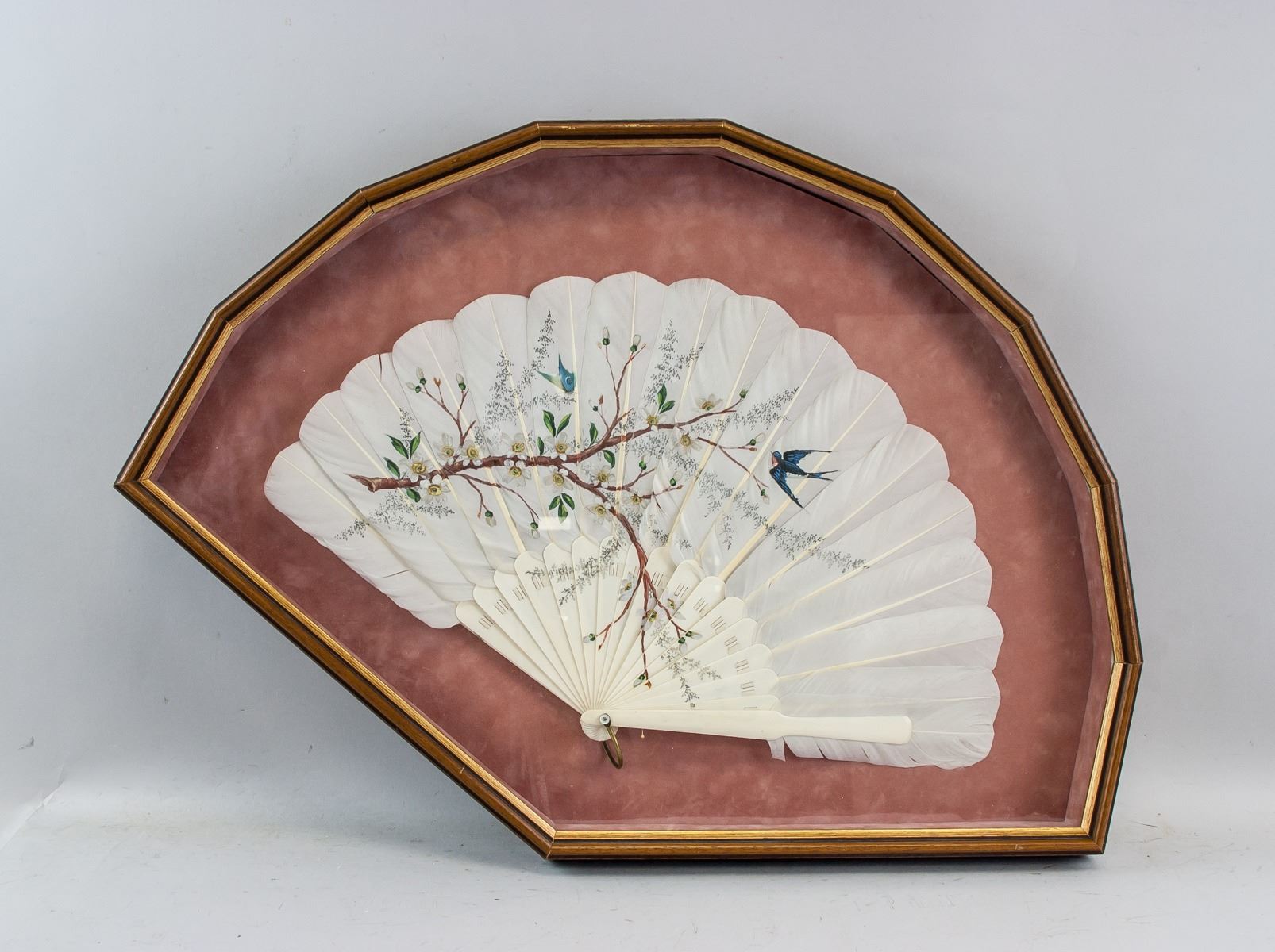 Ink and watercolor on feather fan, framed. Featuring bird, butterfly and flowers. 45 x 27 cm
