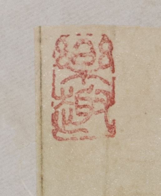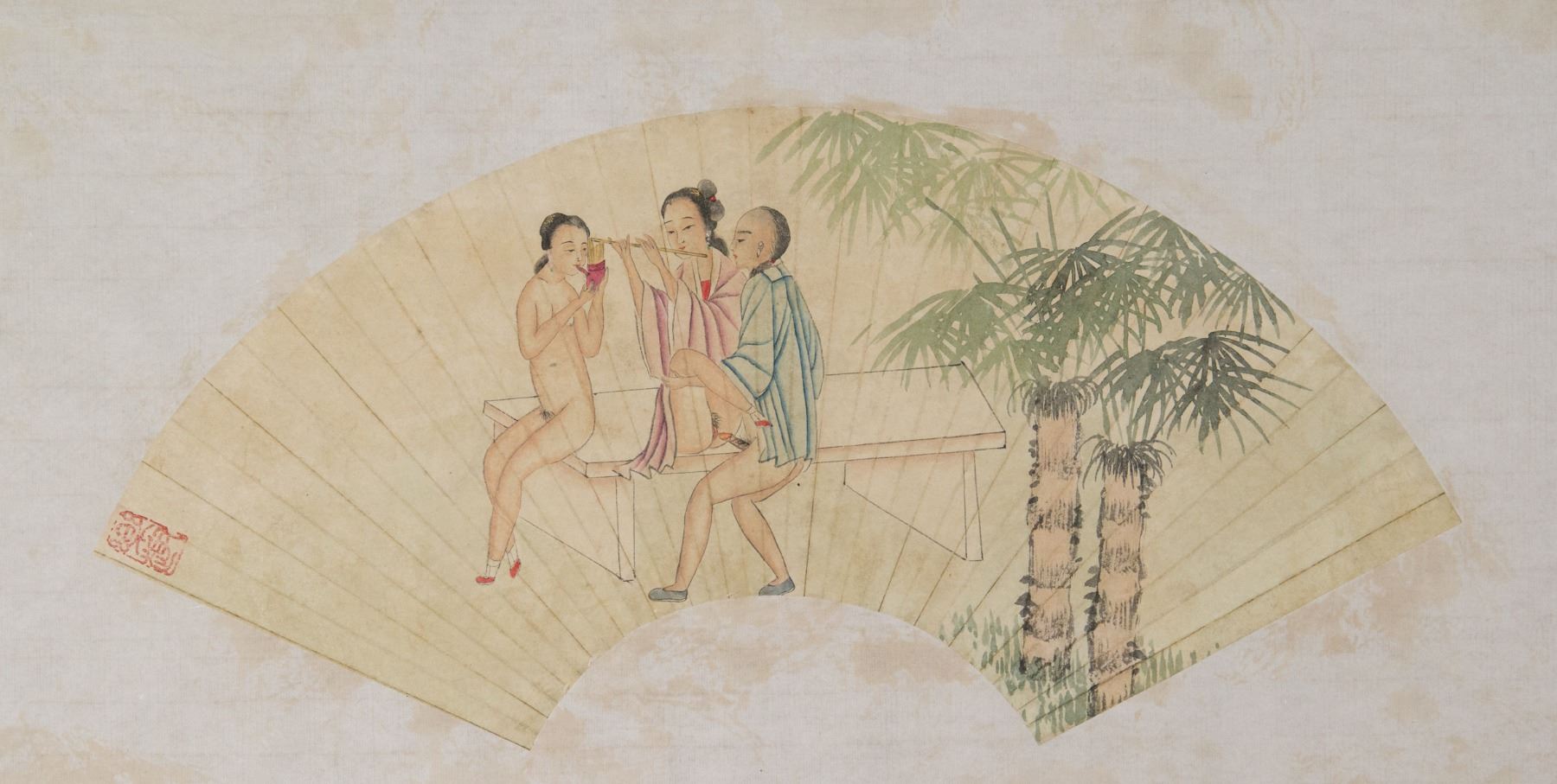 Ink and watercolor on fan paper roll. Featuring erotic scene. Inscribed with one artist seal. 52 x 19.5 cm