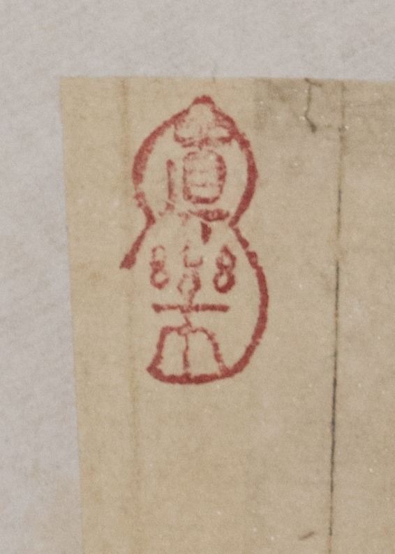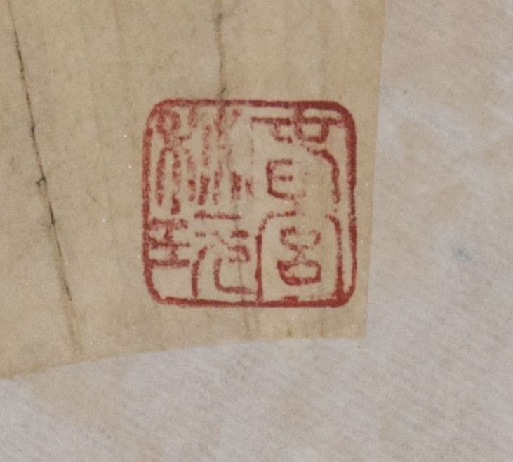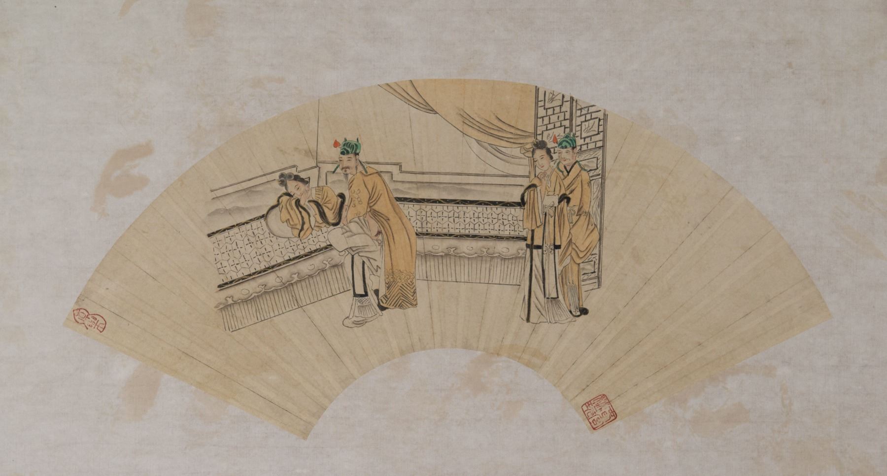 Ink and watercolor on fan paper roll. Featuring erotic scene. Inscribed with three artist seals. 52 x 19.5 cm