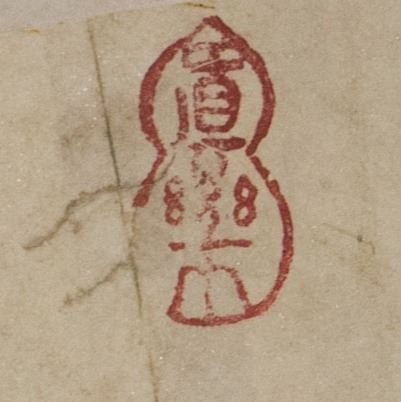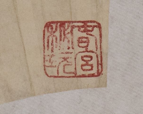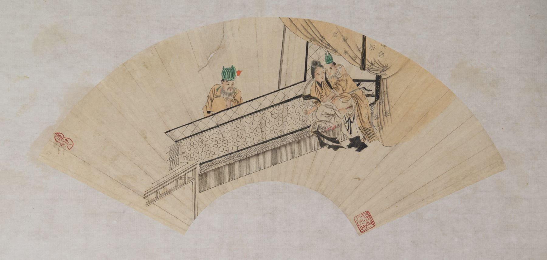 Ink and watercolor on fan paper roll. Featuring erotic scene. Inscribed with two artist seals. 52 x 19.5 cm
