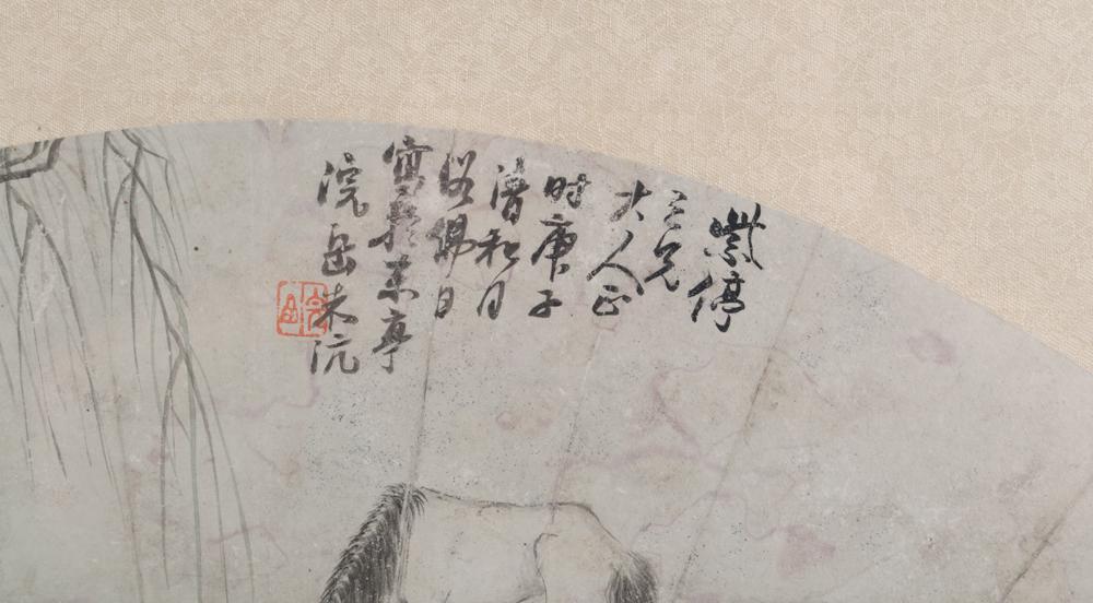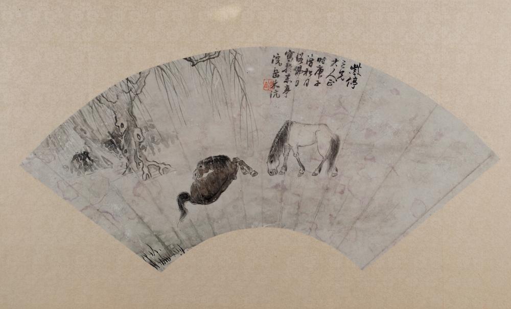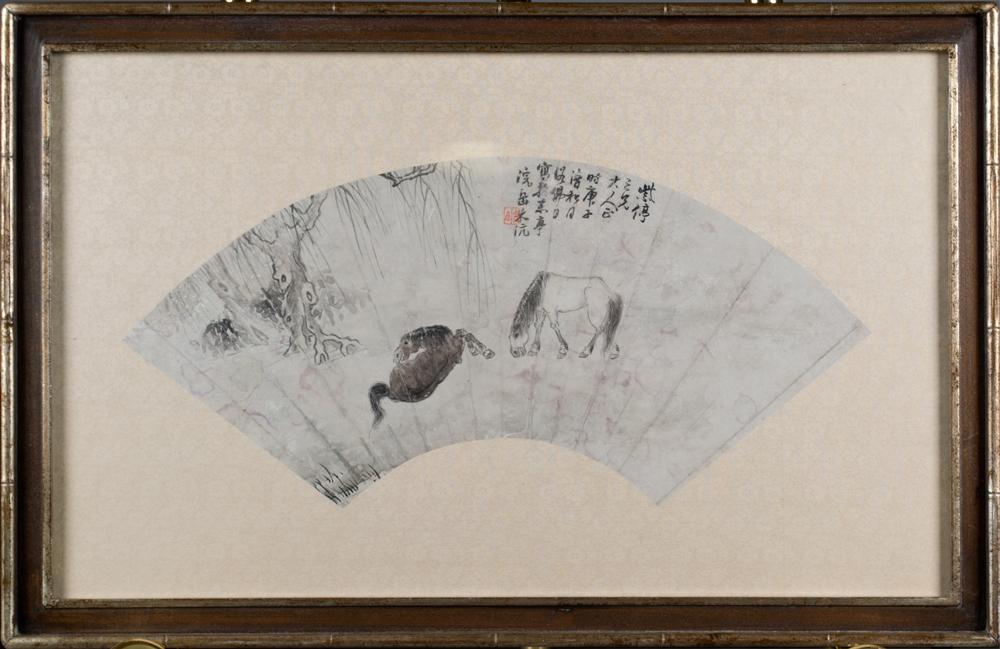 Depicting horses beneath ancient pine trees, with eight lines of caligraphy and seal mark in upper right center. 18.5" W x 8.5" H, sight. Nicely framed and matted, circa 20th century or earlier.