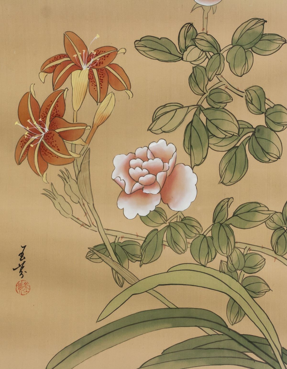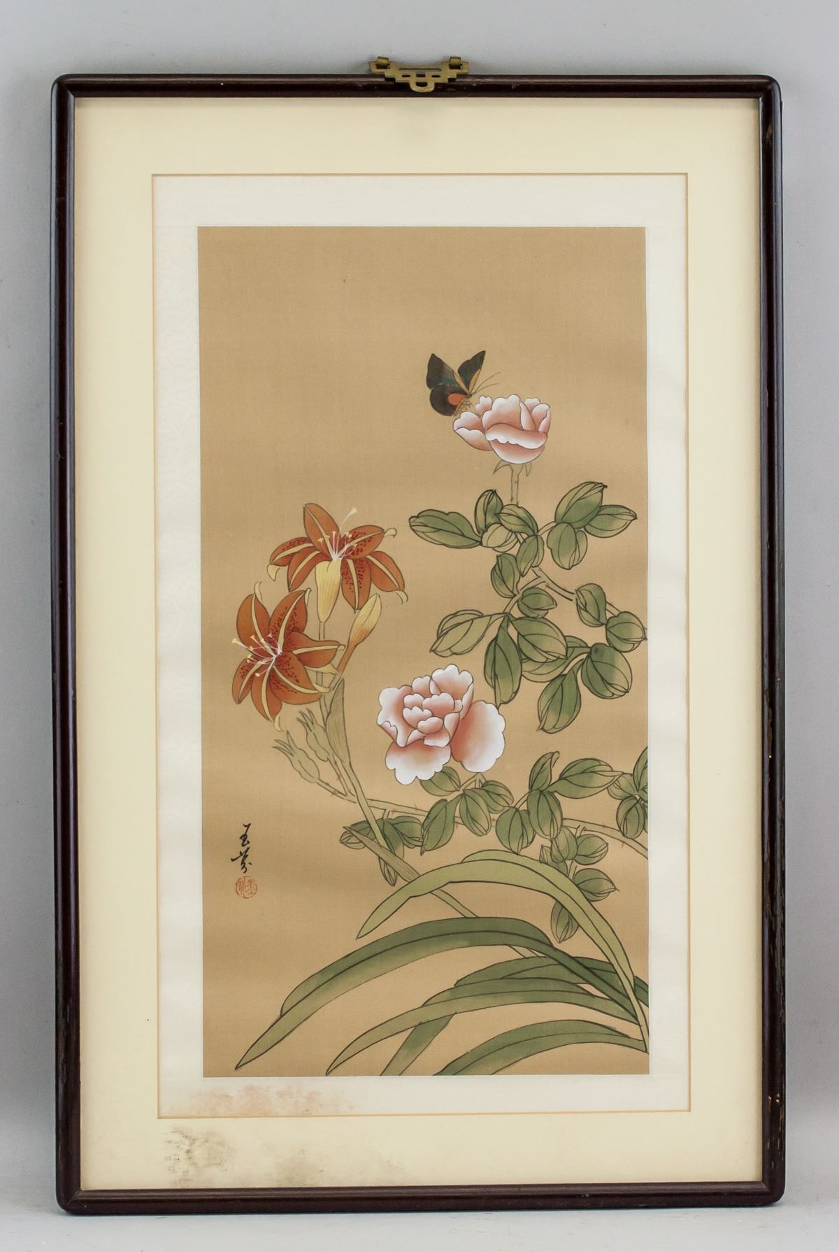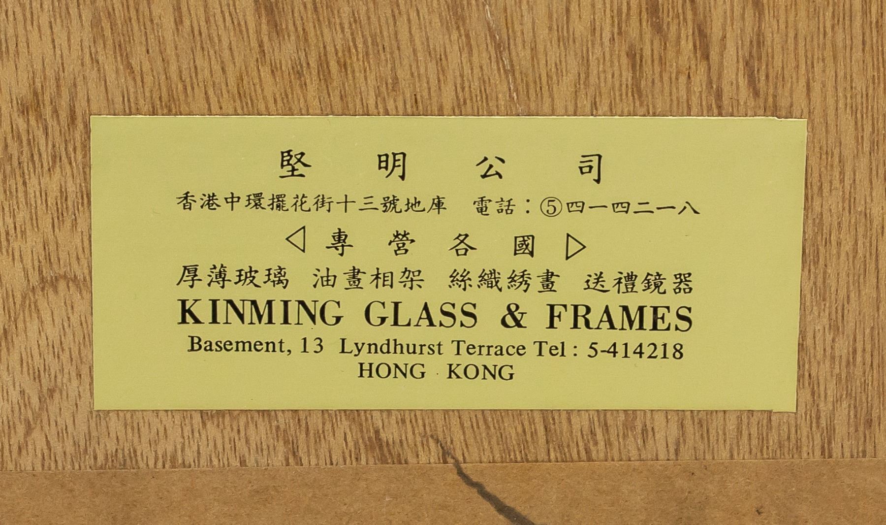 Watercolor on paper, framed. Featuring flower and birds. Label affixed to verso inscribed KINMING GLASS & FRAMES / Basement, 13 Lyndhurst Terrace Tel: 5-414218 / HONG KONG. 52 x 26 cm, Frame: 63 x 40 cm
