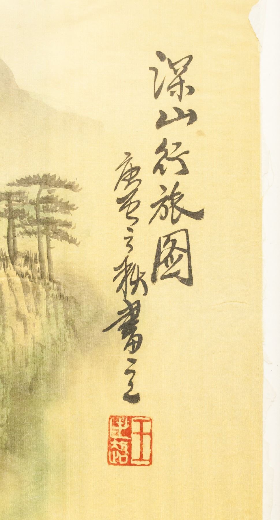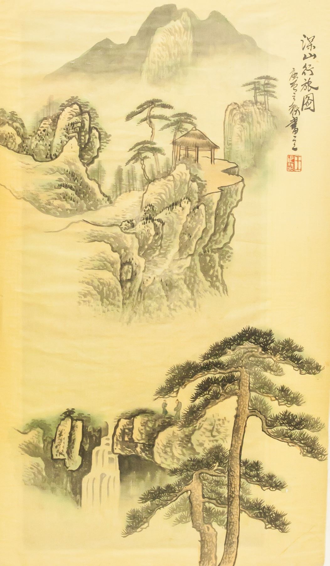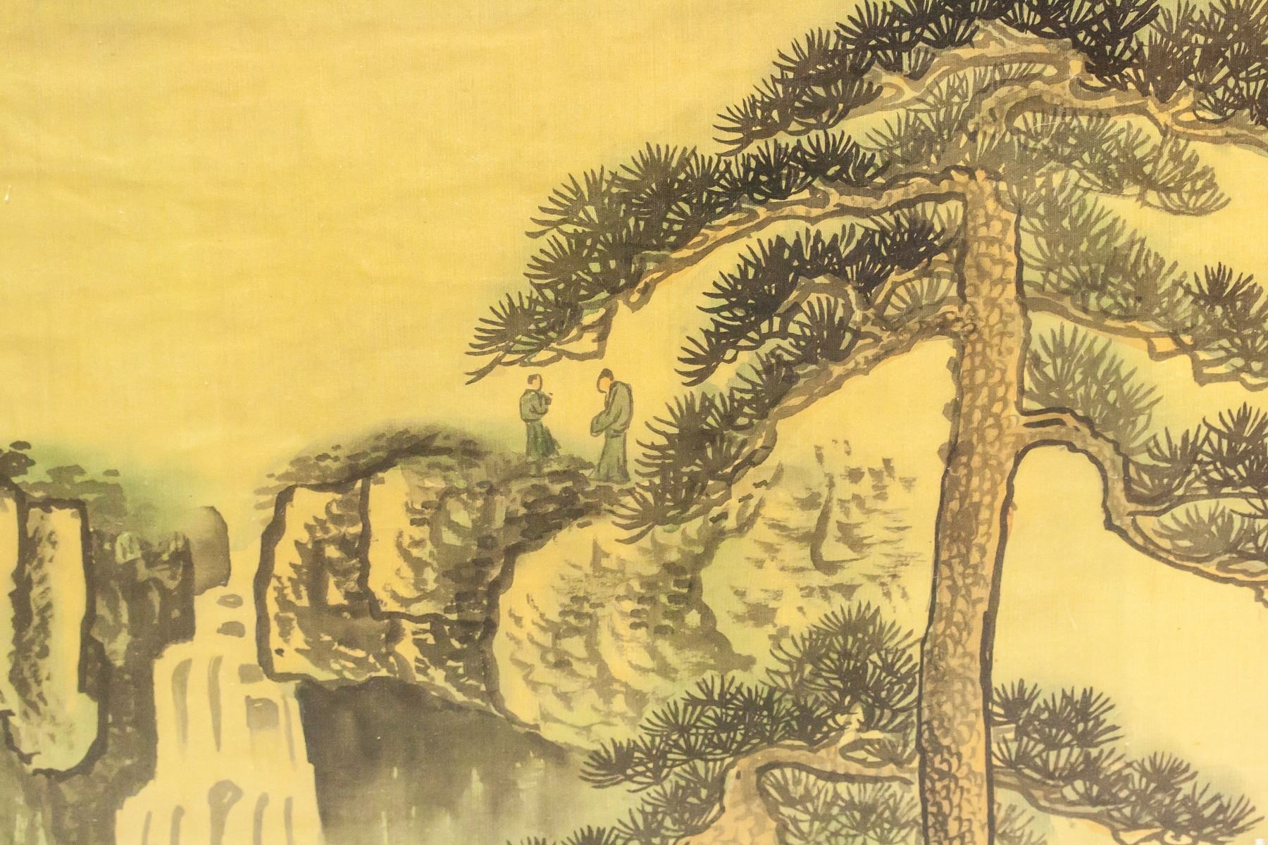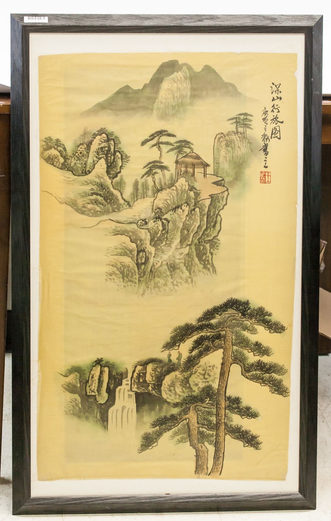 Ink and watercolor on silk, framed. Featuring mountainous landscape and pine. Stamped by artist. 83 x 49 cm, Frame: 97 x 60 cm