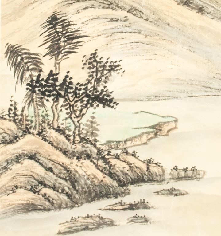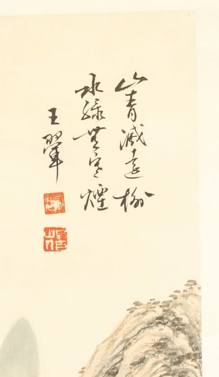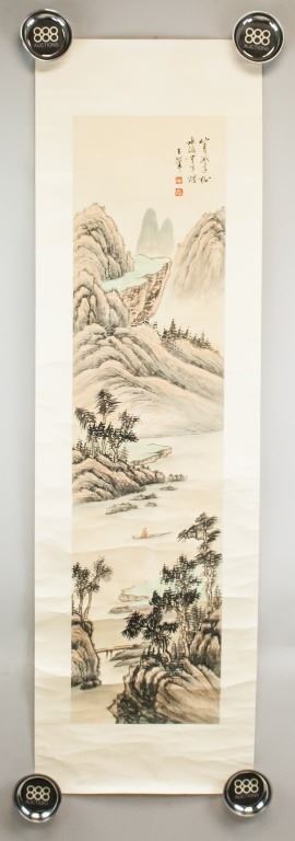 Chinese watercolor on paper roll. Featuring mountain landscape scene. Signed "Wang Hui" in Chinese characters to the top right. Inscribed with two seals. 128 x 12.5 cm.