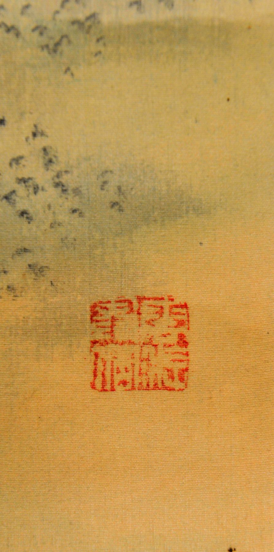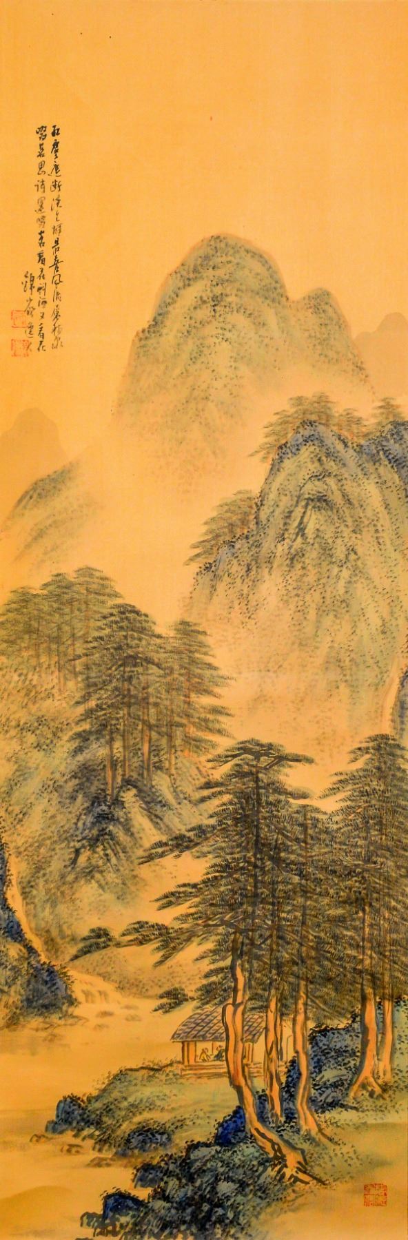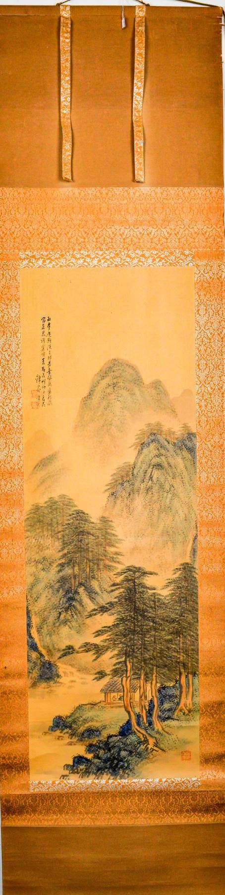 Ink and watercolor on paper, hanging scroll. Featuring mountainous landscape. Signed by artist with 3 seals; 107 cm x 36 cm