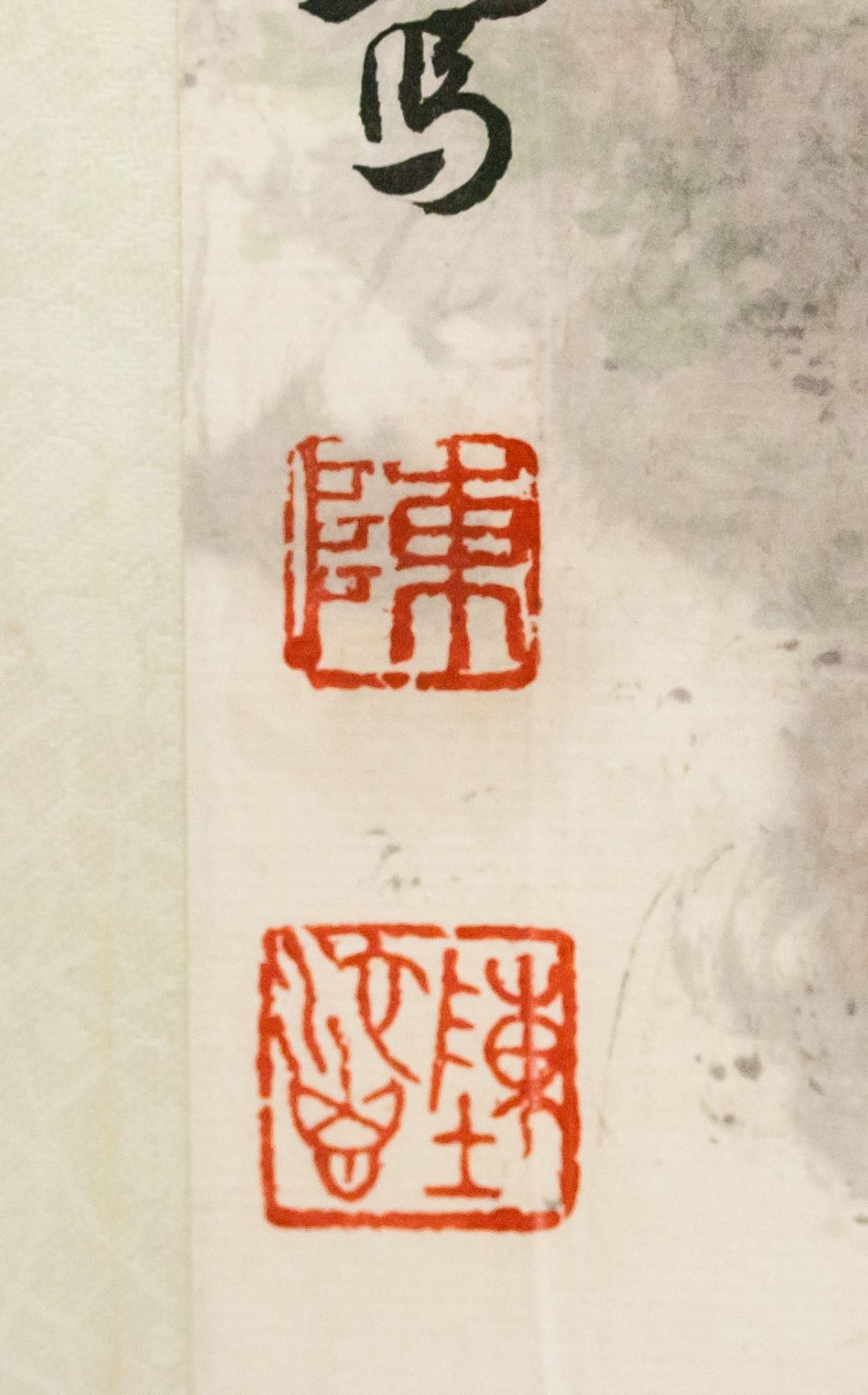 Chinese ink and watercolor on paper, framed. Featuring landscape scene of a small boat sailing by a rocky cliff. Calligraphy and seals to the left. Frame: 120.5 x 55 cm.