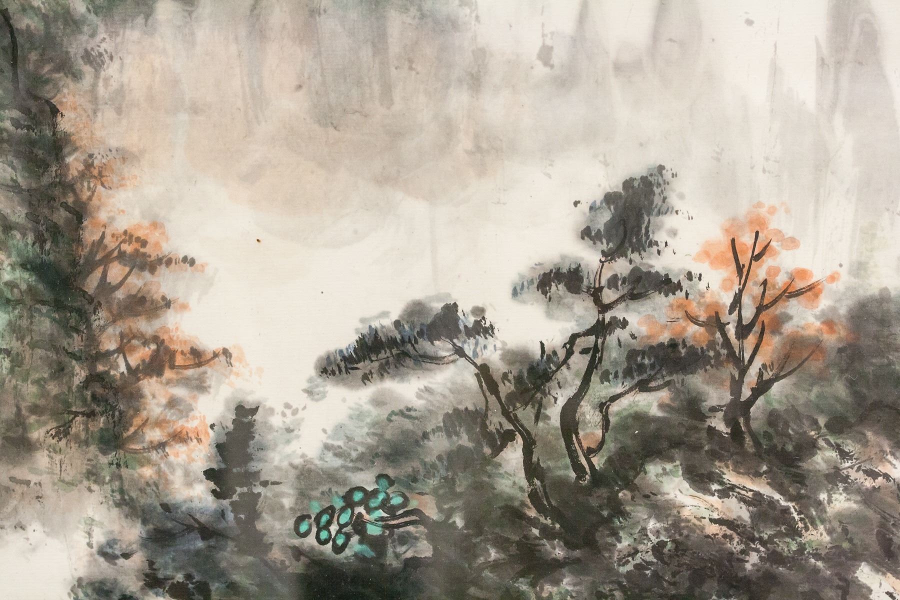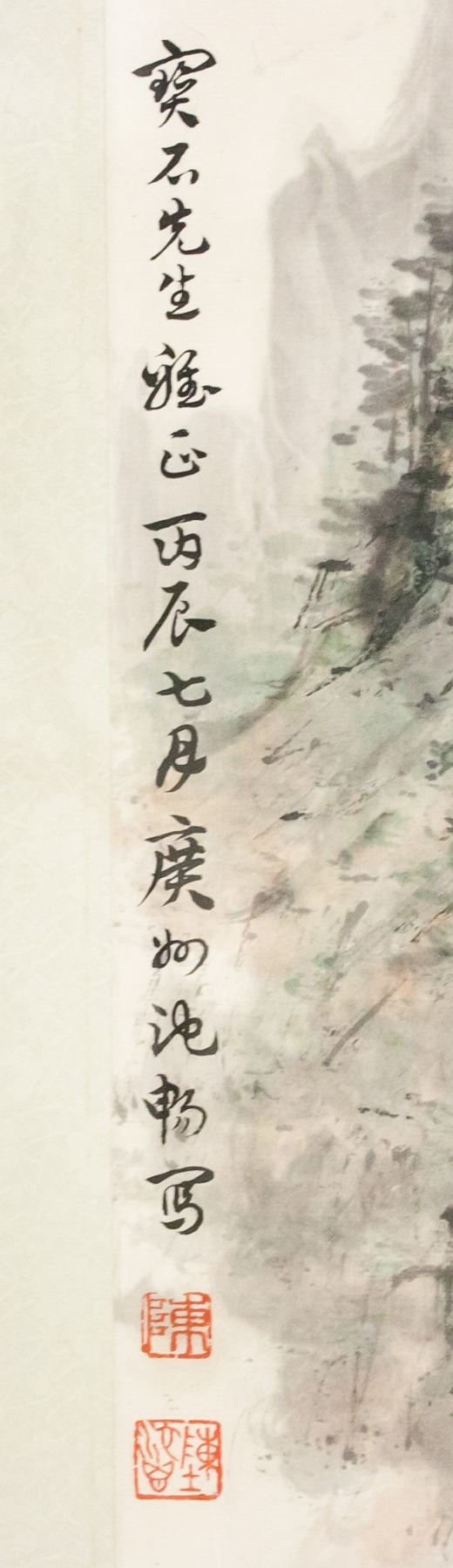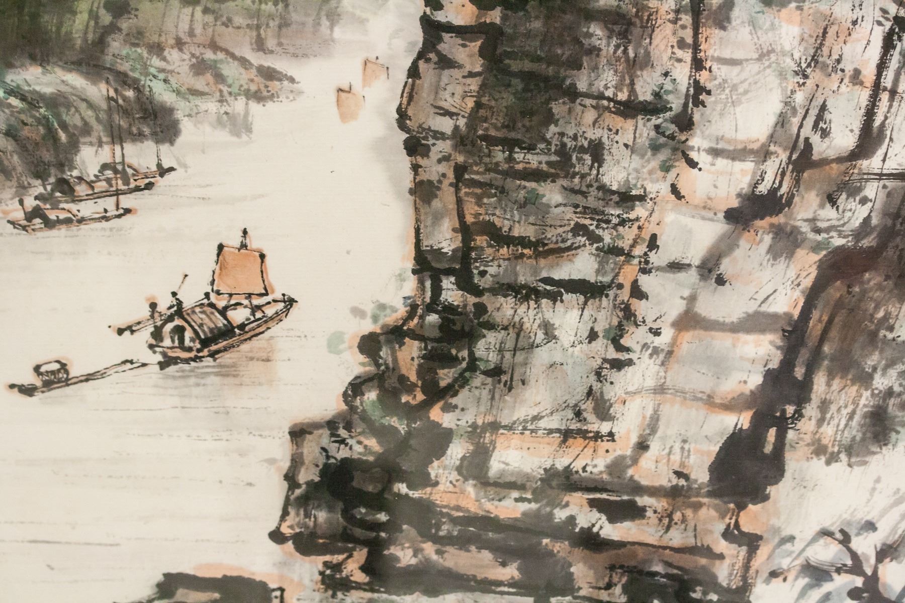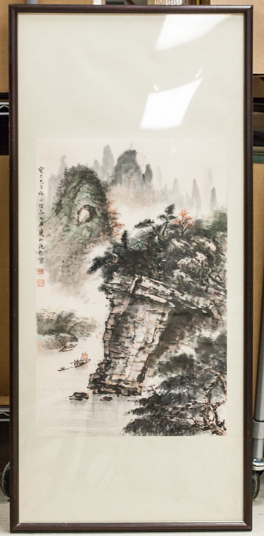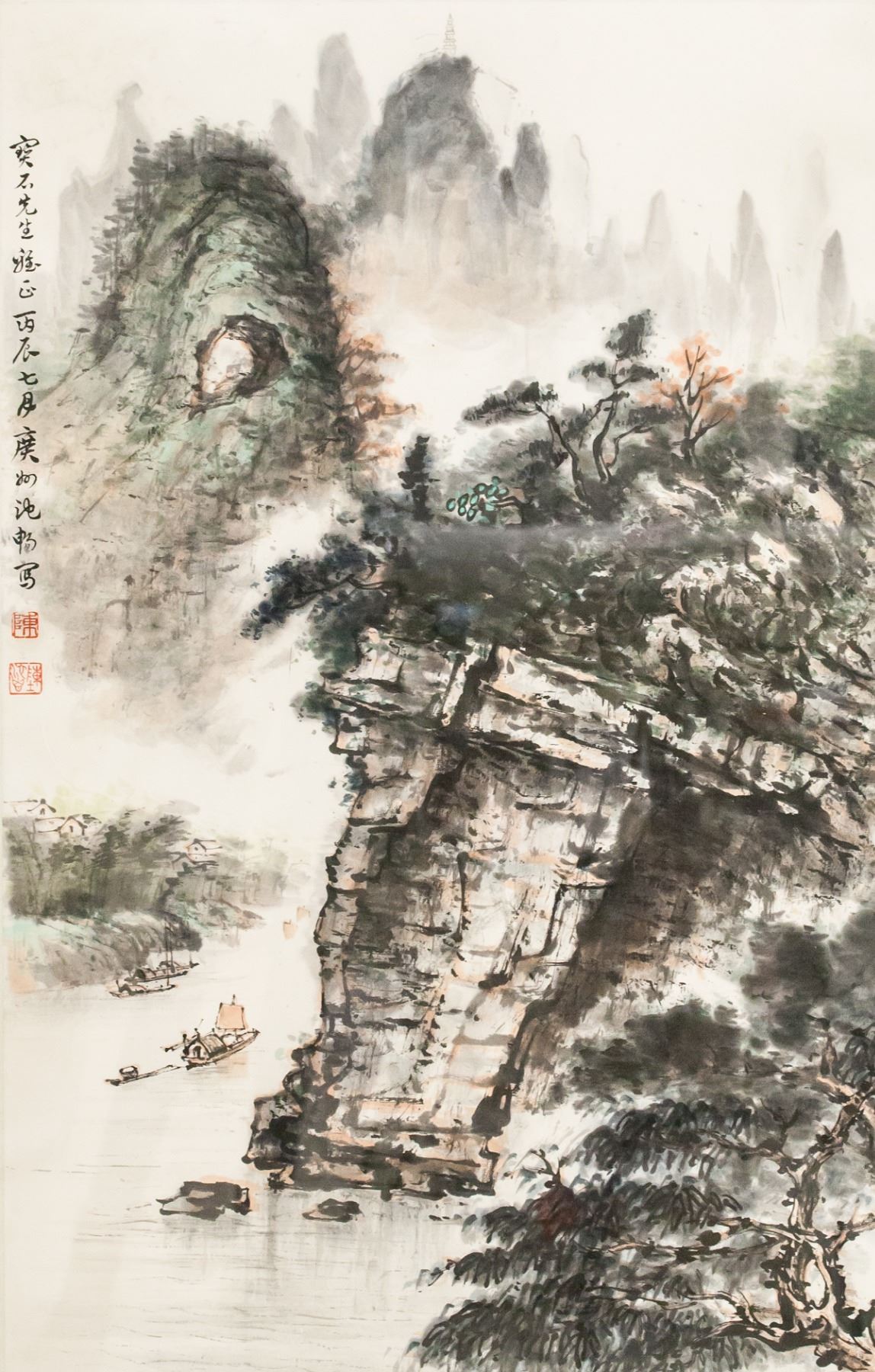 Chinese ink and watercolor on paper, framed. Featuring landscape scene of a small boat sailing by a rocky cliff. Calligraphy and seals to the left. Frame: 120.5 x 55 cm.