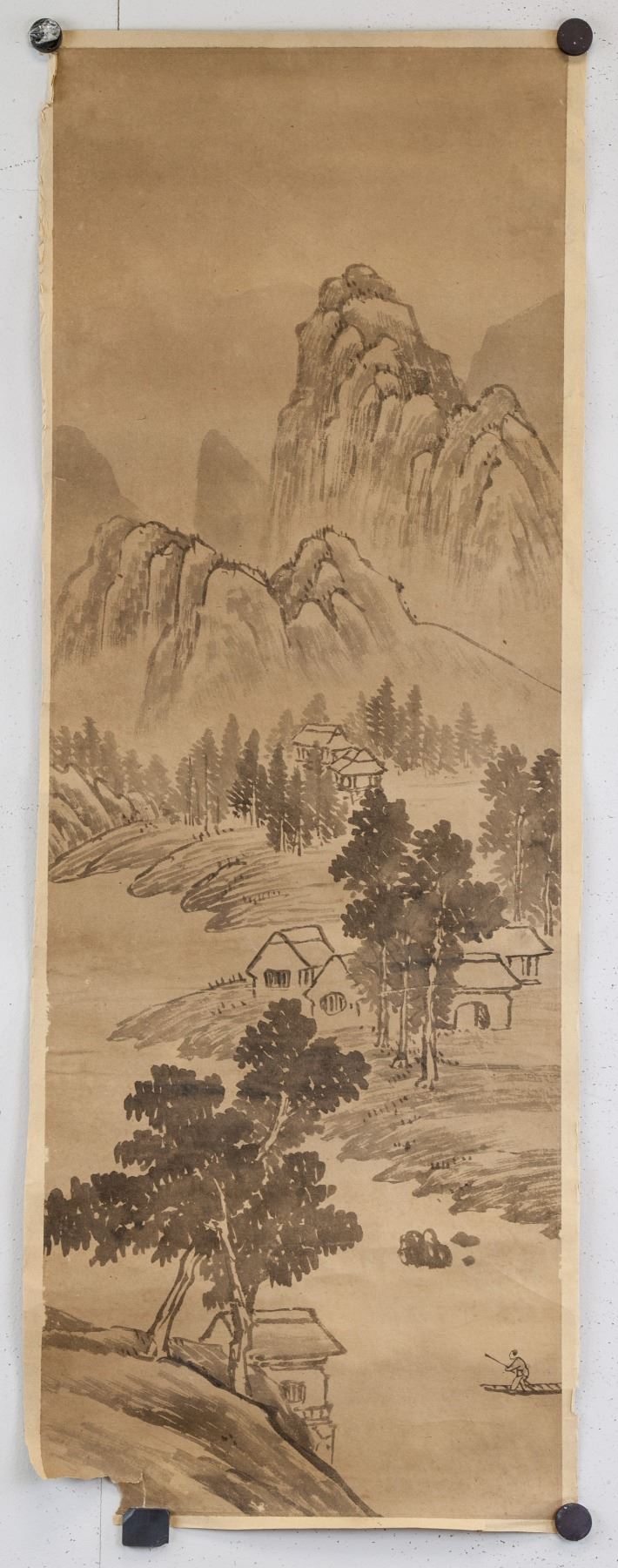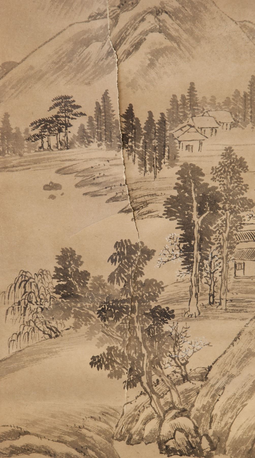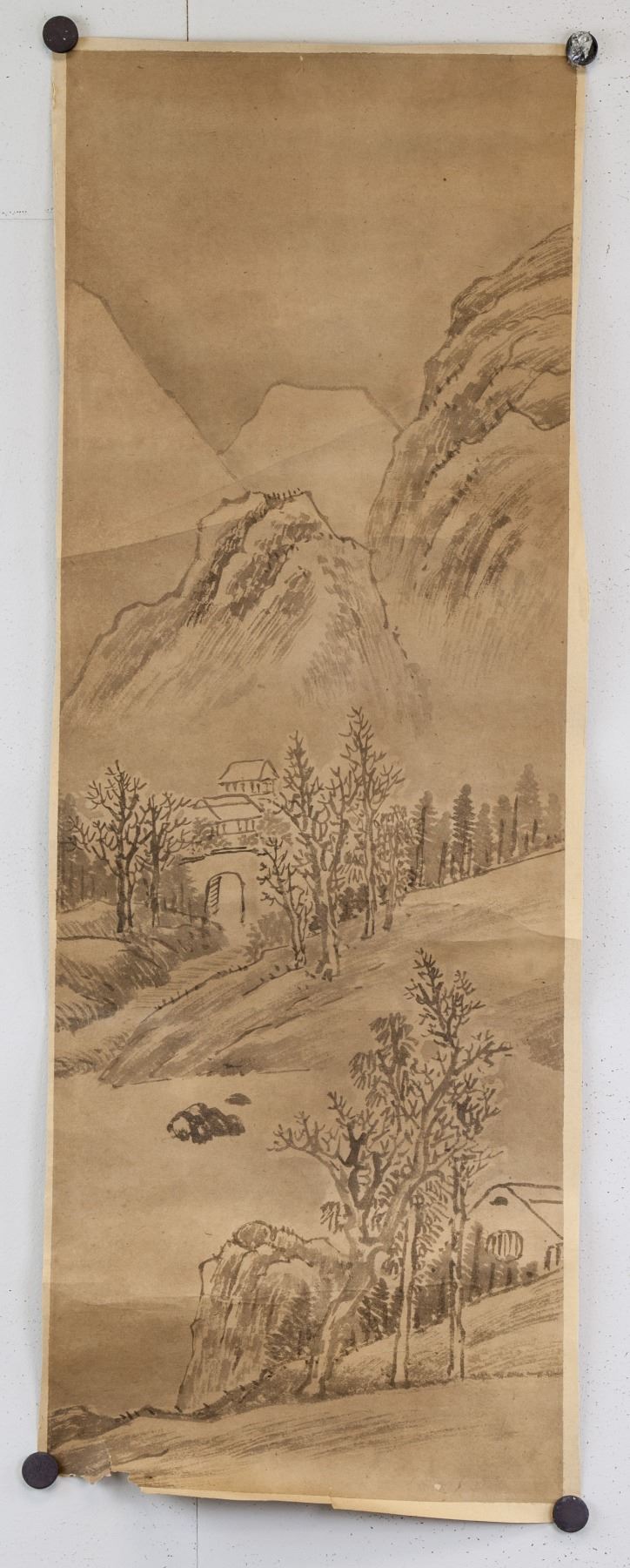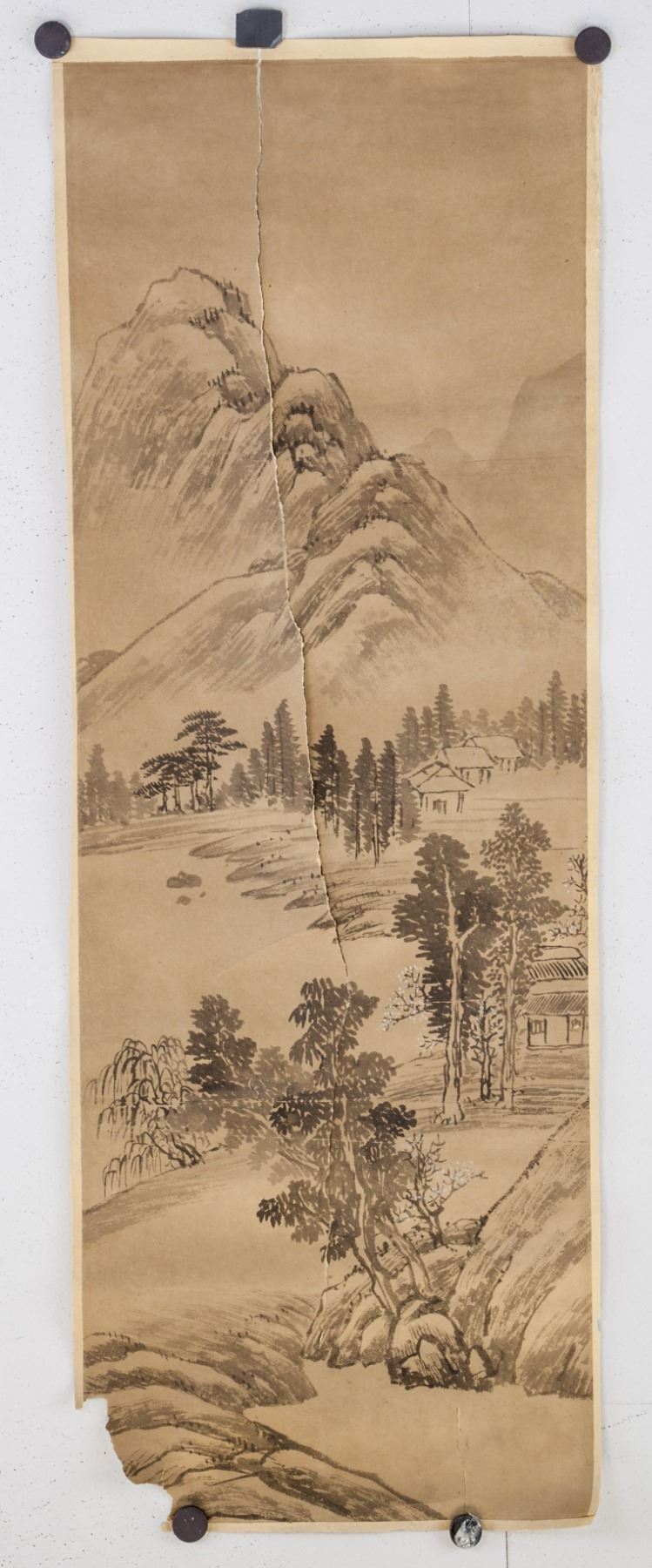 Ink on paper roll. Featuring pair Mountainous landscape. No signature or seal. 78 x 29 cm. Poor condition, ripped edges, cuts on the painting surface, fold marks, tapped back. PROVENANCE: Private Japanese-American collection, acquired by present owner shortly after passing of previous owner