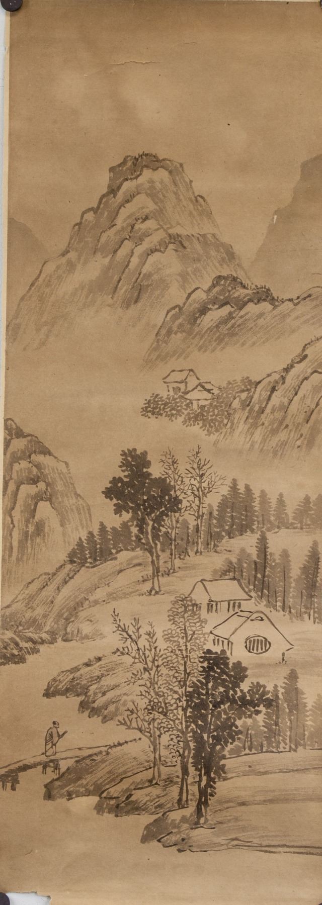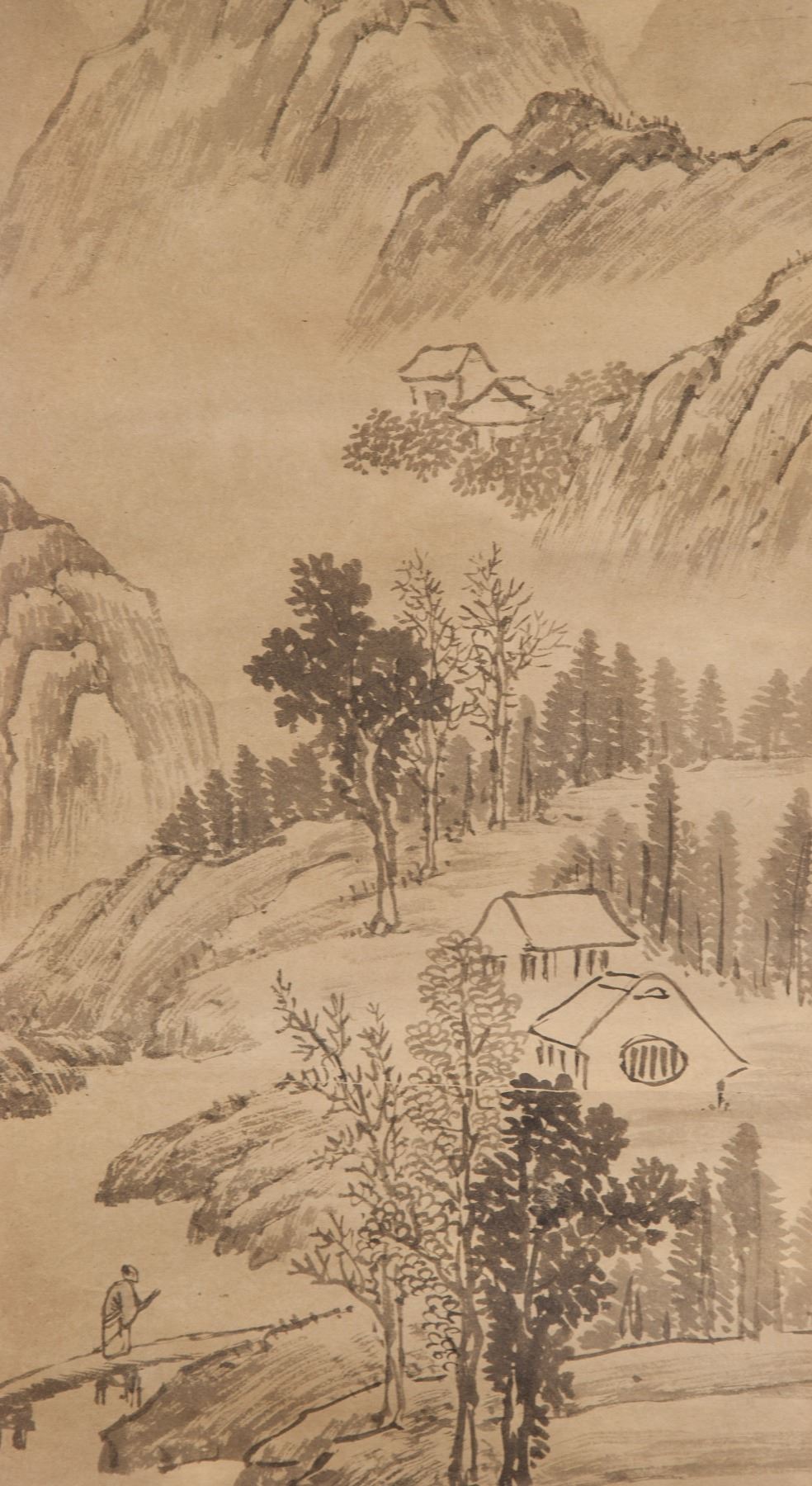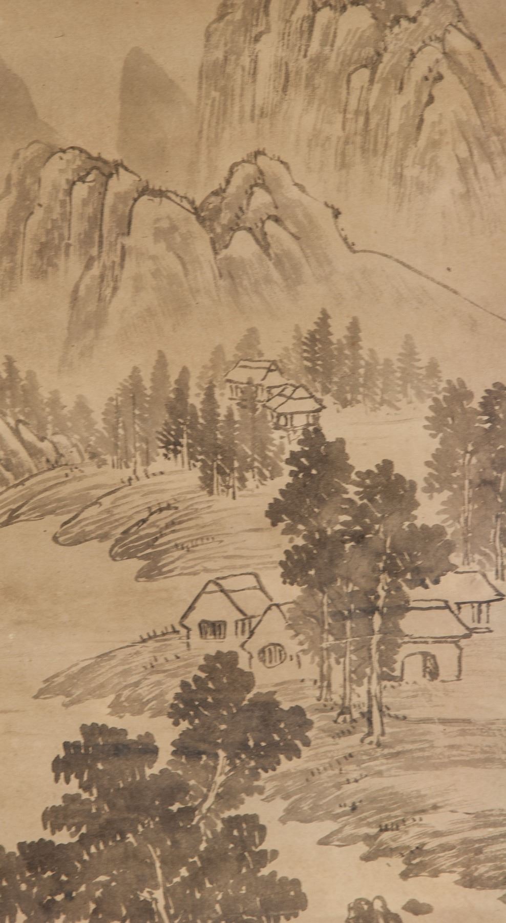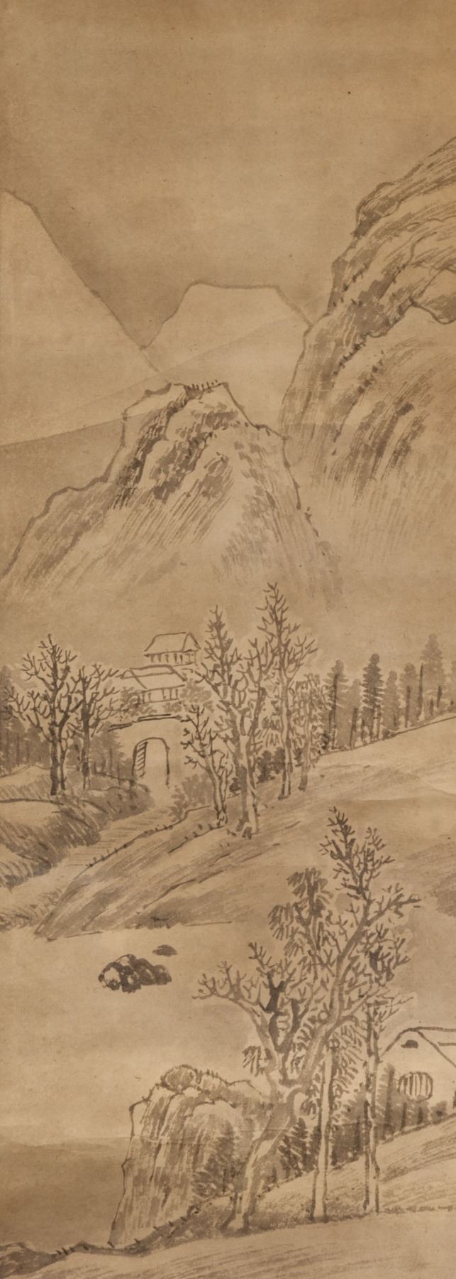 Ink on paper roll. Featuring pair Mountainous landscape. No signature or seal. 78 x 29 cm. Poor condition, ripped edges, cuts on the painting surface, fold marks, tapped back. PROVENANCE: Private Japanese-American collection, acquired by present owner shortly after passing of previous owner