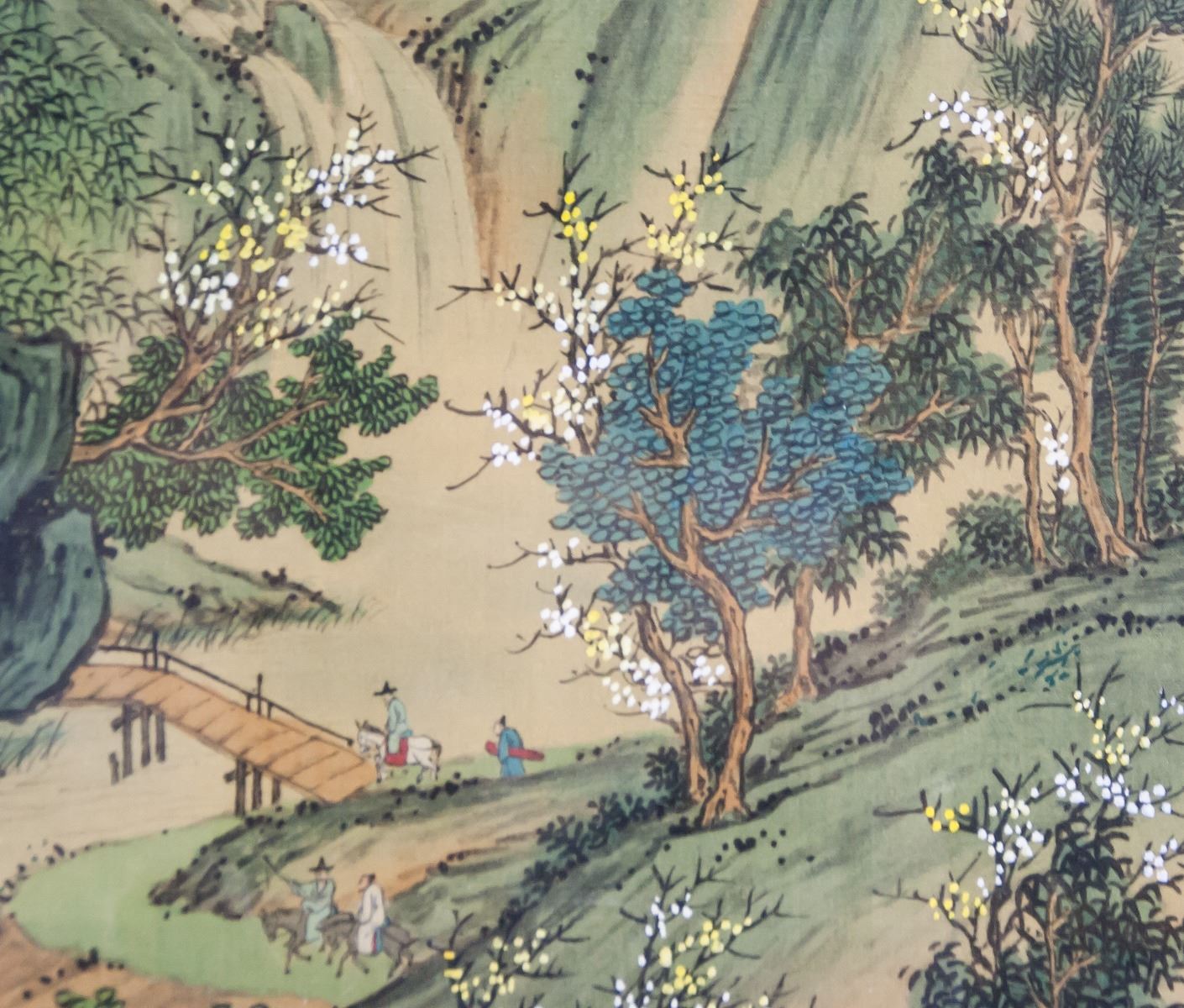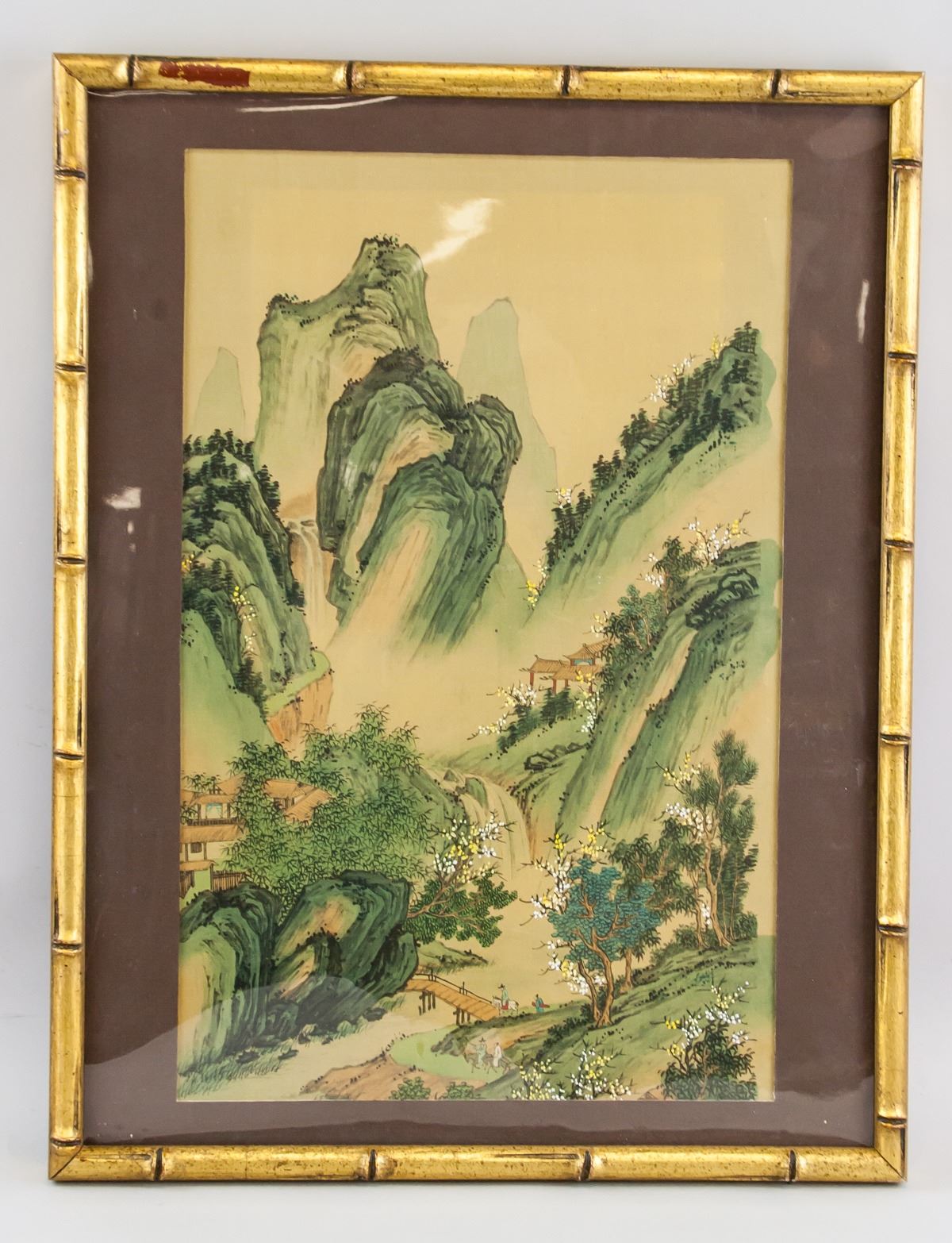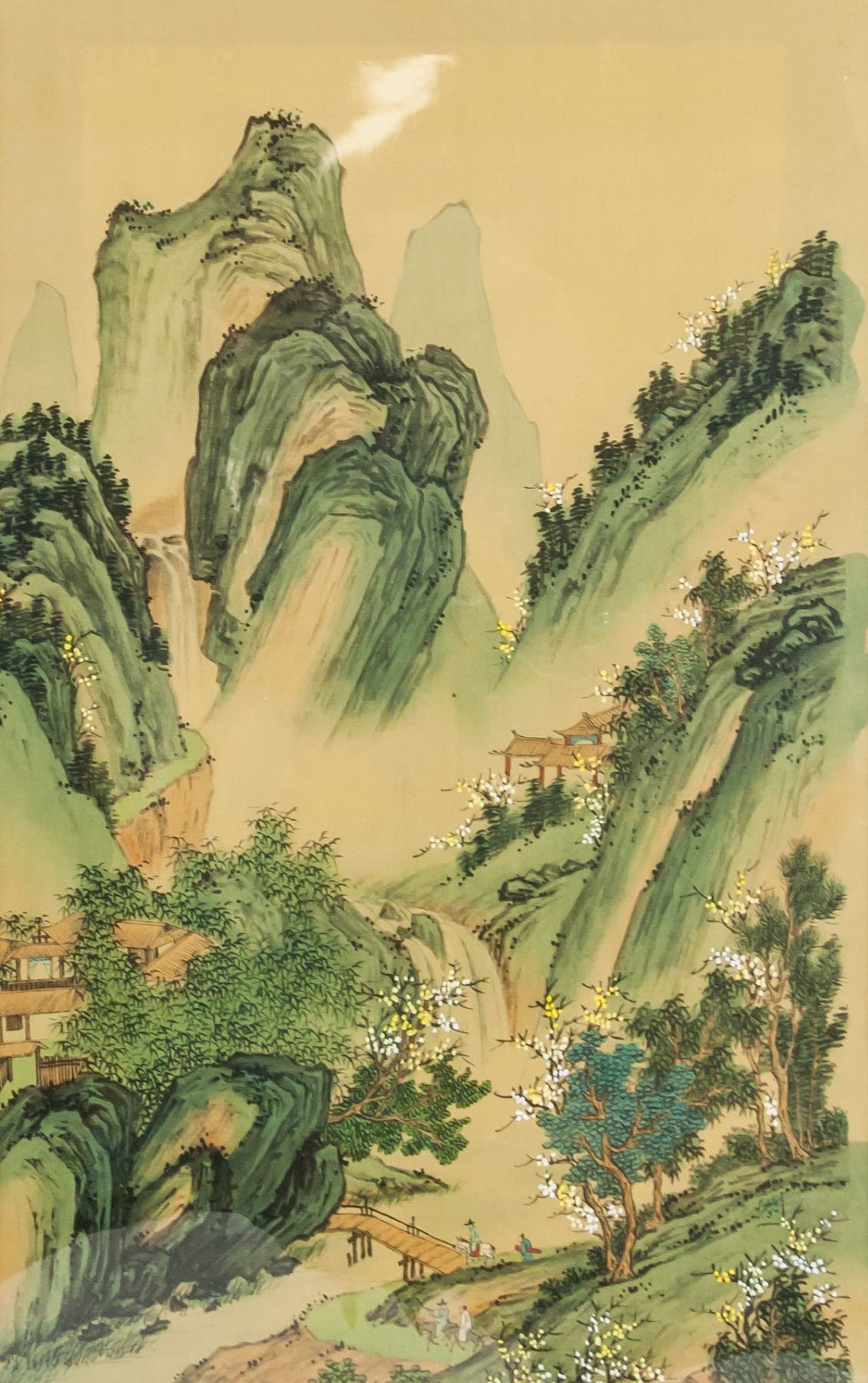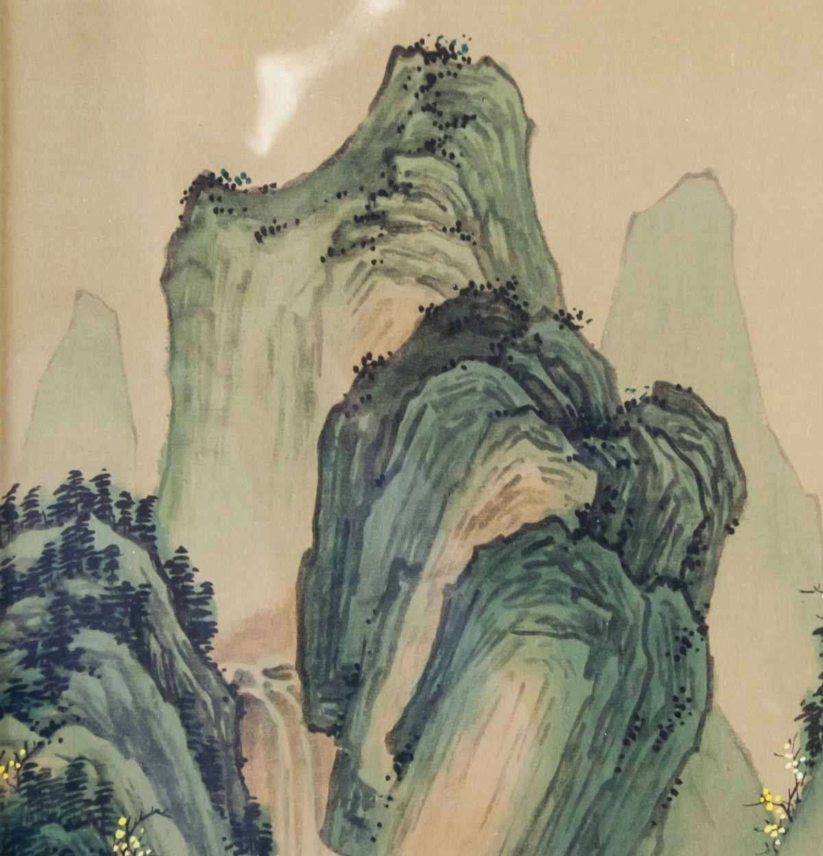 Watercolor on silk, framed. Featuring a landscape scene. Label affixed to verso near bottom of frame TMP - 1502 TACTMARK. 50 x 29 cm (19.7 x 11.4 inches). Framed size: 58 x 43 cm (22.8 x 16.9 inches)