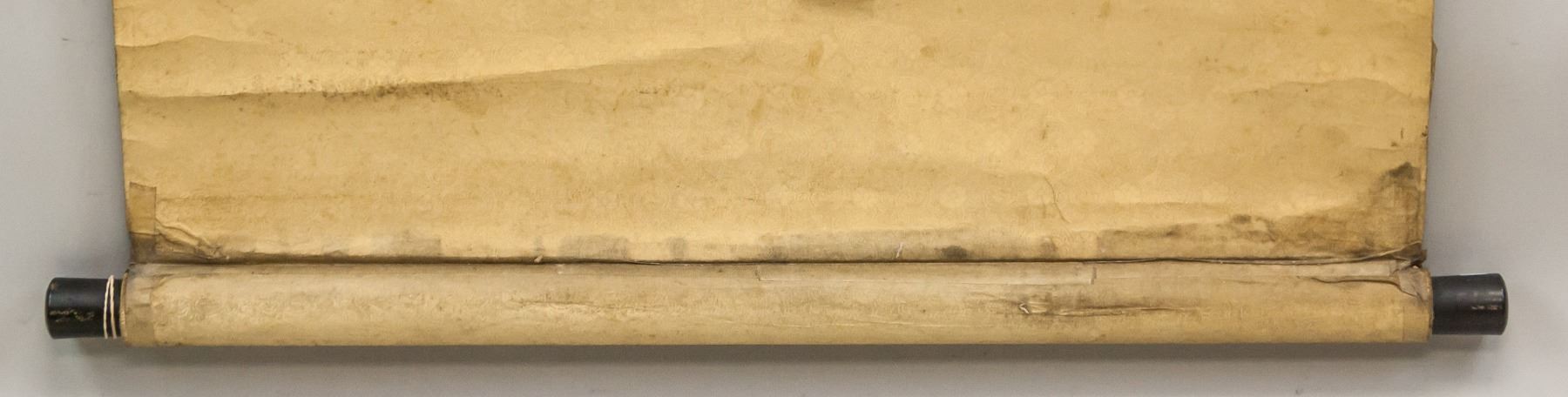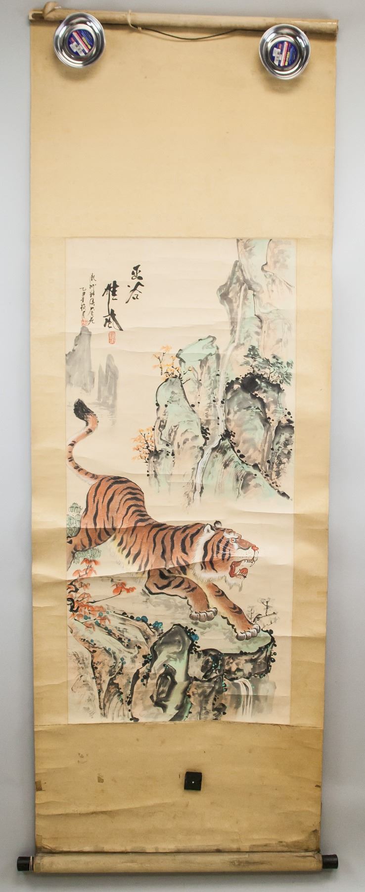 Watercolor on scroll. Featuring a tiger prowling through the mountains. Featuring two stamps. In lightly damaged condition. 105 x 48 cm