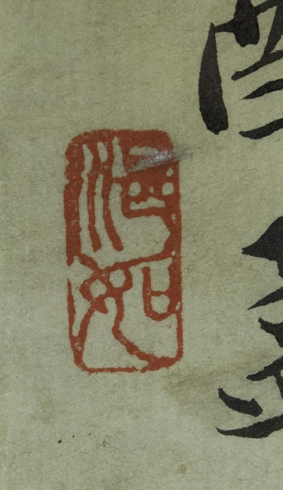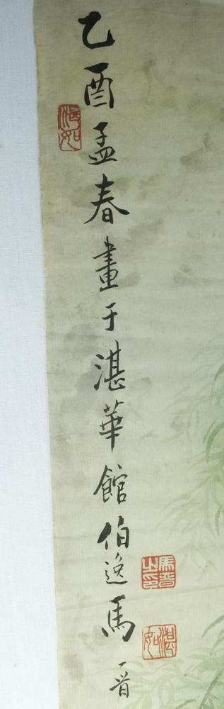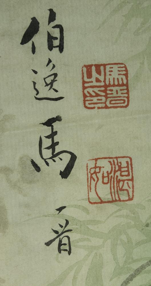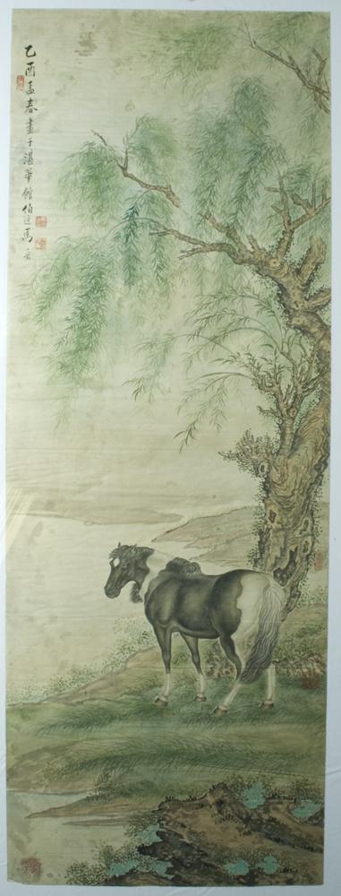 Ma Jin, 1900-1970. Finely painted to depict black and white horse standing under a tree, facing a body of water. Signature and three seal marks in UL, seal mark in LL, and two seal marks along right side, closer to bottom. 43" H x 16" W, unframed.