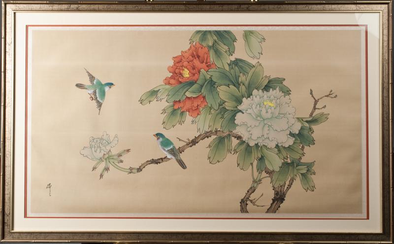 Finely painted to depict blue birds amongst foliage, signed LL, 21" H x 36" W (sight), framed and matted with silk brocade border, the frame carved to depict bamboo. Circa early 20th century.