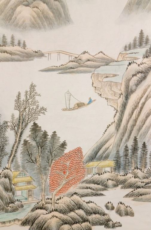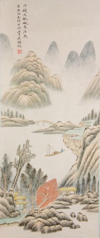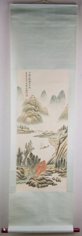 Ink and watercolor on paper, hanging scroll. Featuring a village in mountain landscape scene. Signed Wu Hufan (1894-1968, Chinese), inscribed with one artist seal. 92 x 39 cm. Deep crease top right and bottom