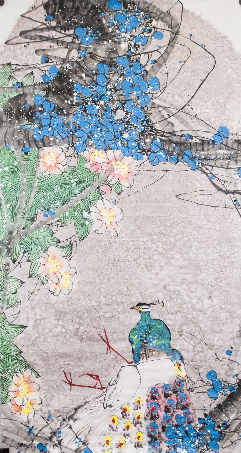 Ink and watercolor on paper. Featuring peacock and flowers. 127 x 68 cm