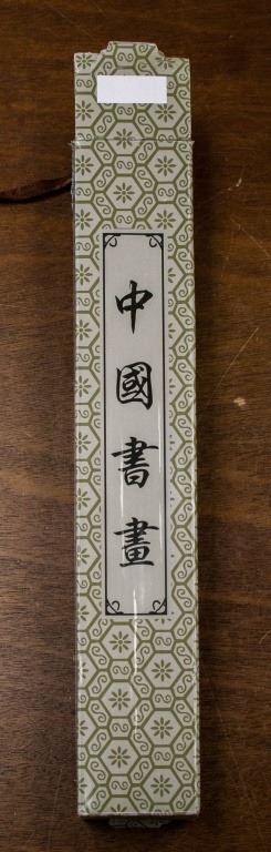 Chinese watercolor on paper. Featuring brilliant purple and blue landscape scene, with a small yellow boat sailing down the water. 67 x 25 cm .