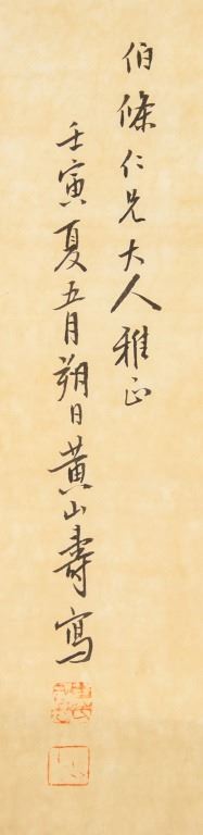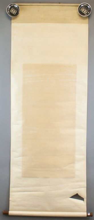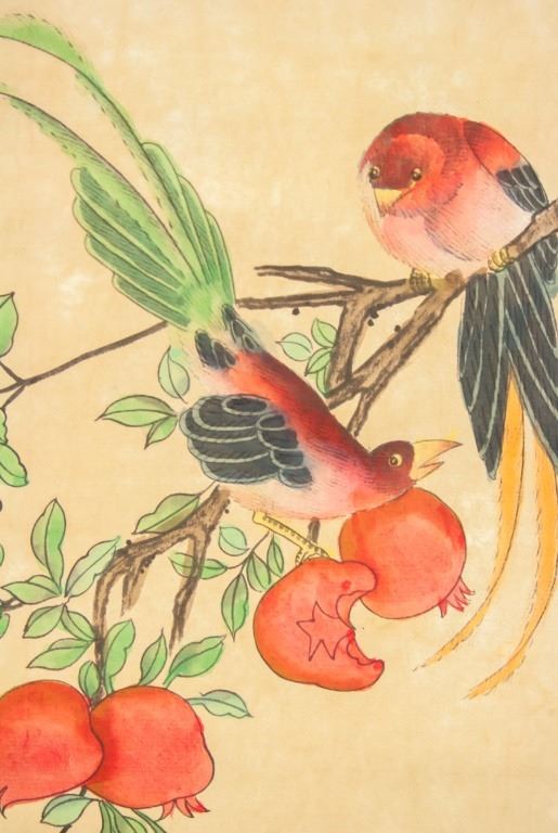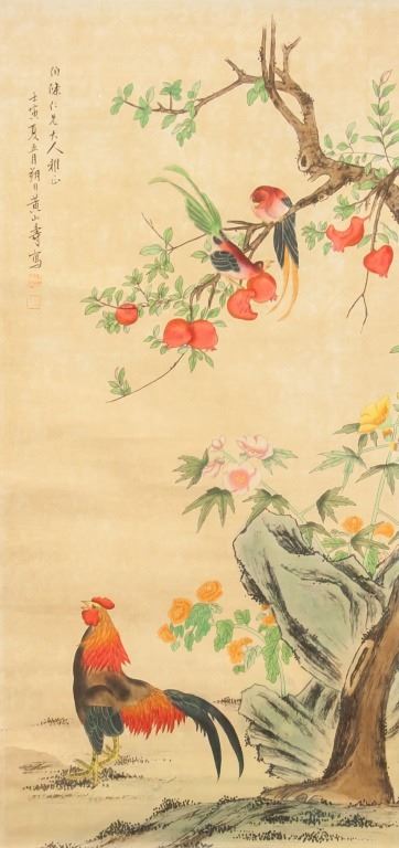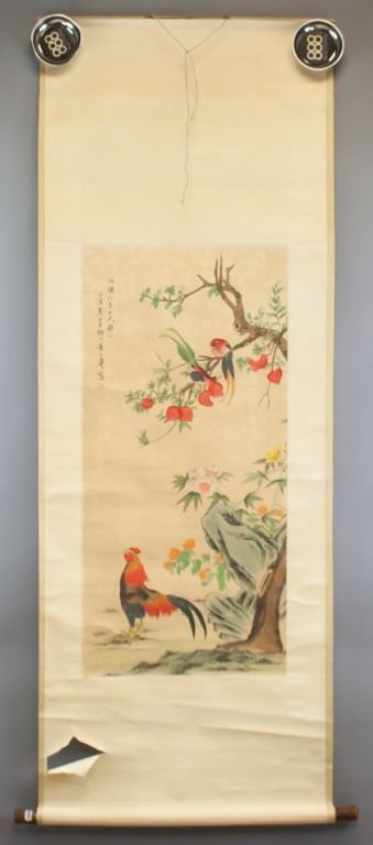 Chinese watercolor on paper. Featuring landscape scene of a rooster standing under a tree with a bird perched in the branches. Inscribed with two seals. Damage to scroll. 89 x 43 cm.