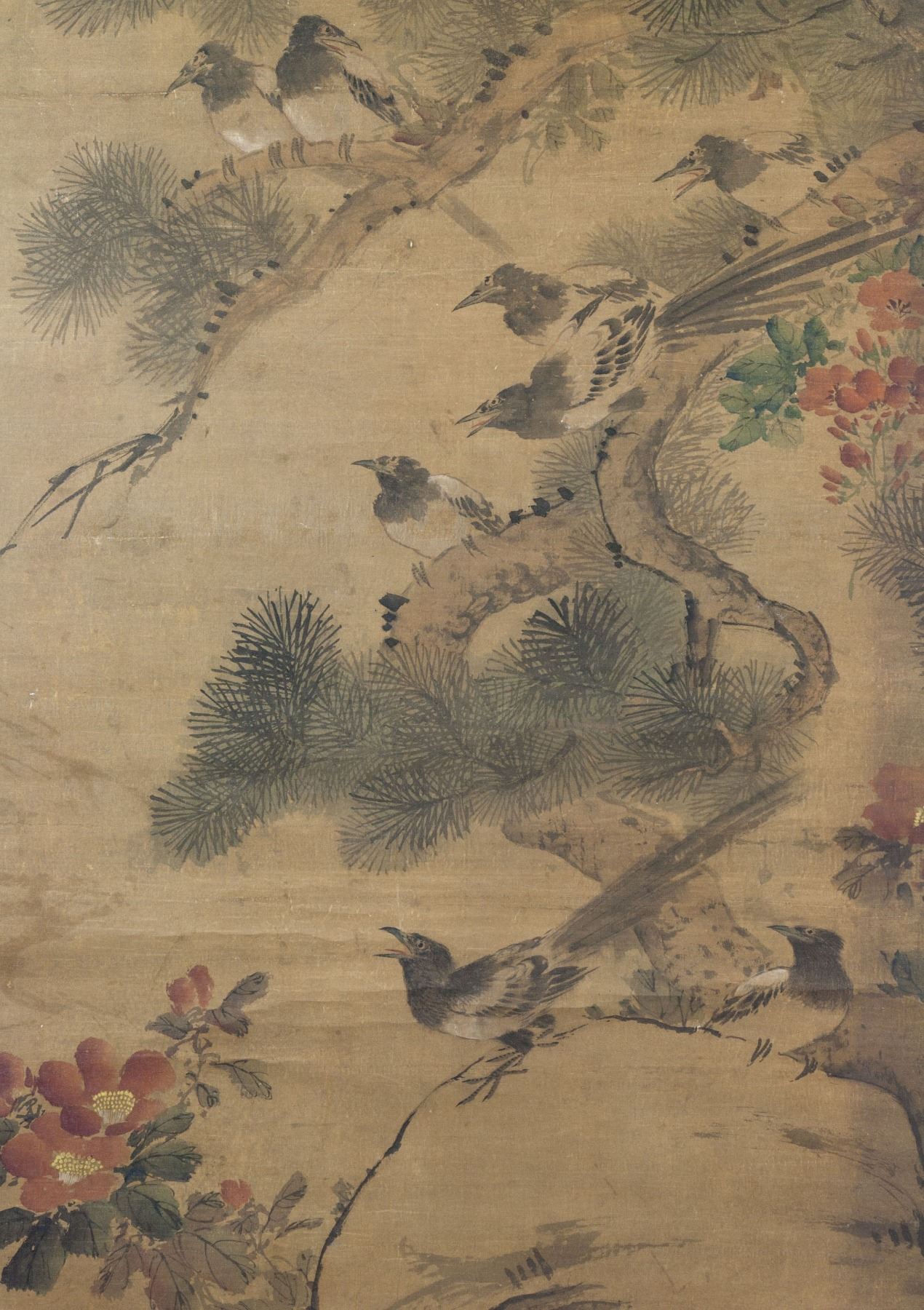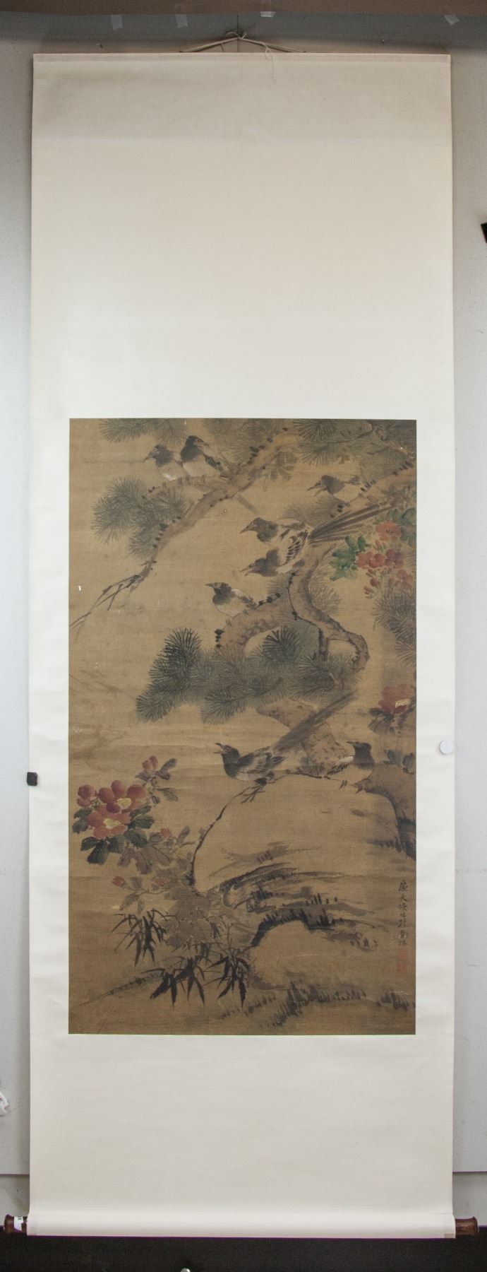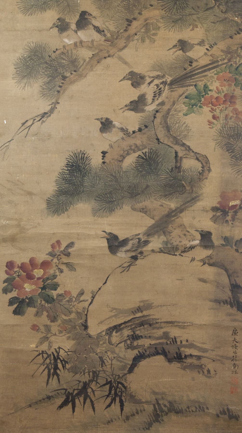 Ink and watercolor on silk, hanging scroll. Featuring birds, pine tree and flowers. Signed by artist; inscribed with 2 artist seals; 115 cm x 64 cm